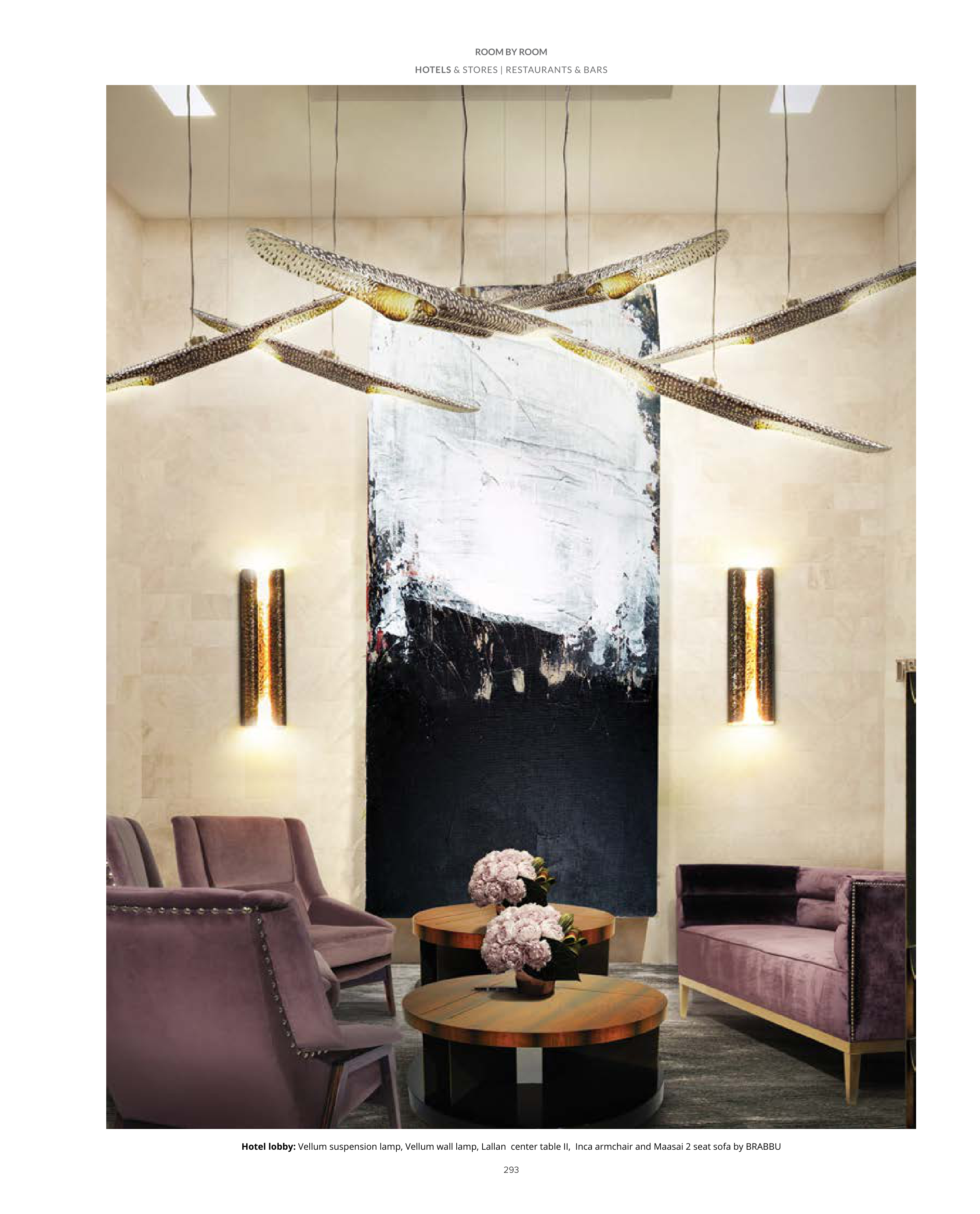Hotel lobby: Vellum suspension lamp, Vellum wall lamp, Lallan center table II, Inca armchair and Maasai 2 seat sofa by BRABBU