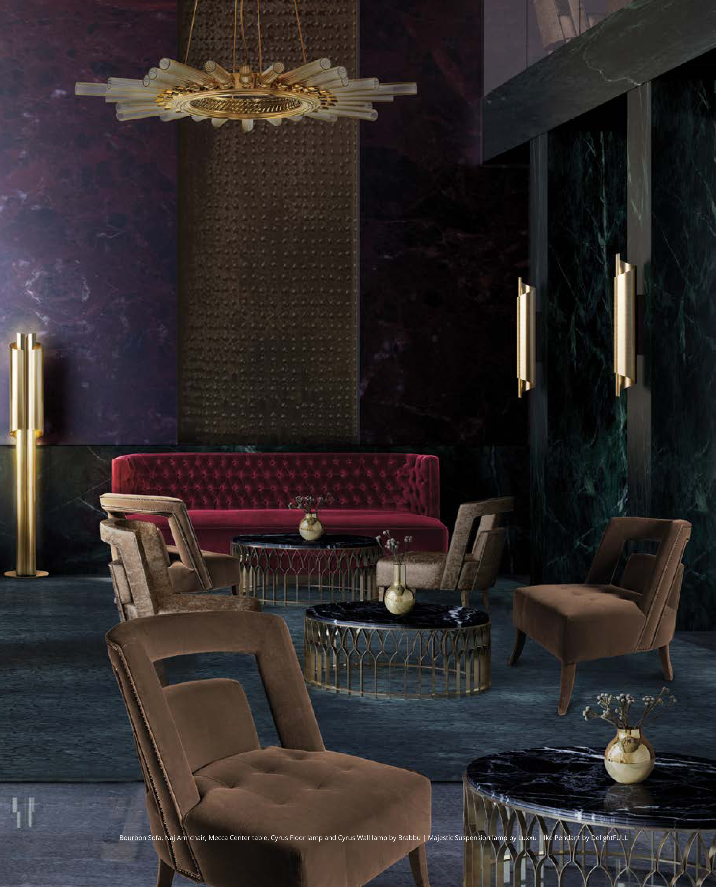 395 Bourbon Sofa, Naj Armchair, Mecca Center table, Cyrus Floor lamp and Cyrus Wall lamp by Brabbu | Majestic Suspension lamp by Luxxu | Ike Pendant by DelightFULL