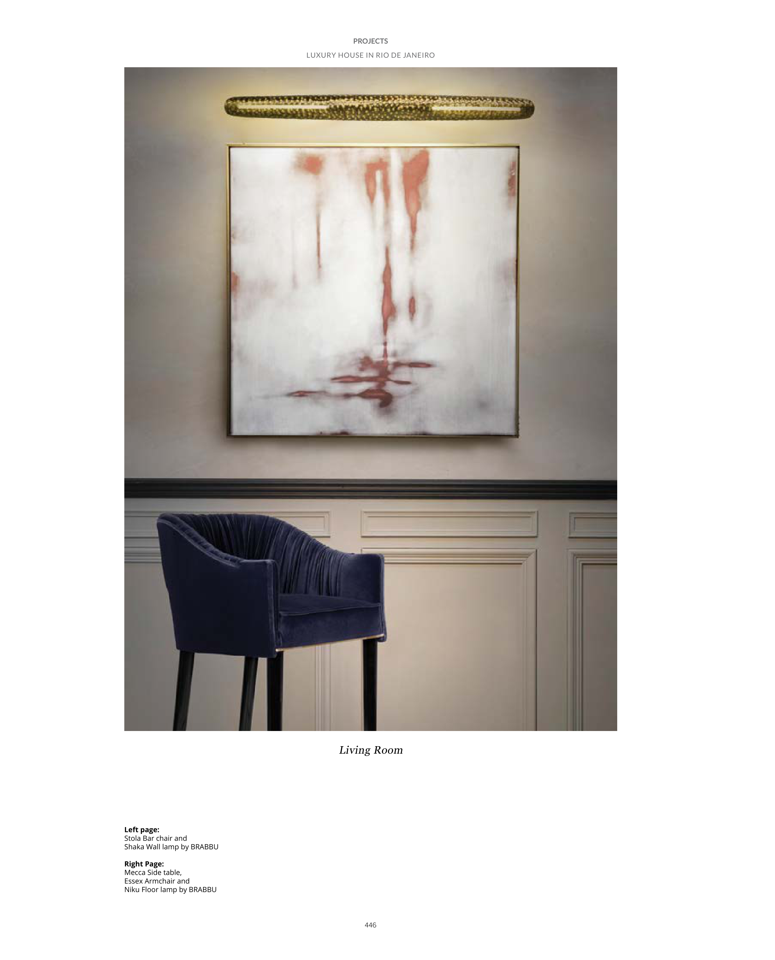 446 LUXURY HOUSE IN RIO DE JANEIRO PROJECTS Left page: Stola Bar chair and Shaka Wall lamp by BRABBU Right Page: Mecca Side table, Essex Armchair and Niku Floor lamp by BRABBU Living Room