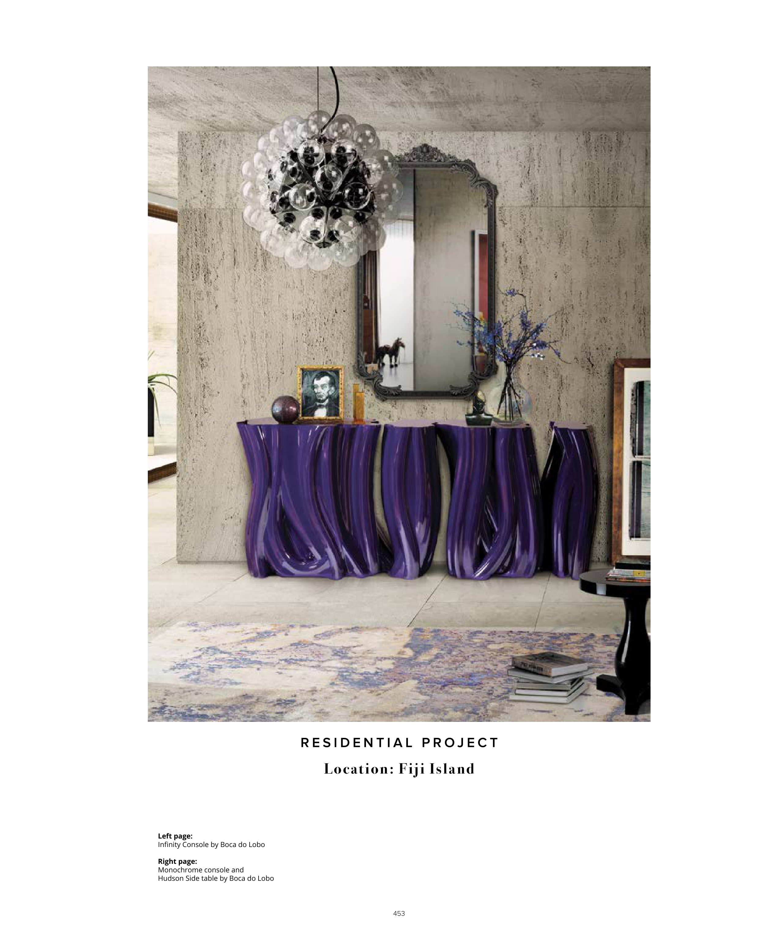 453 R E S I D E N T I A L P R O J E C T Location: Fiji Island Left page: Infinity Console by Boca do Lobo Right page: Monochrome console and Hudson Side table by Boca do Lobo