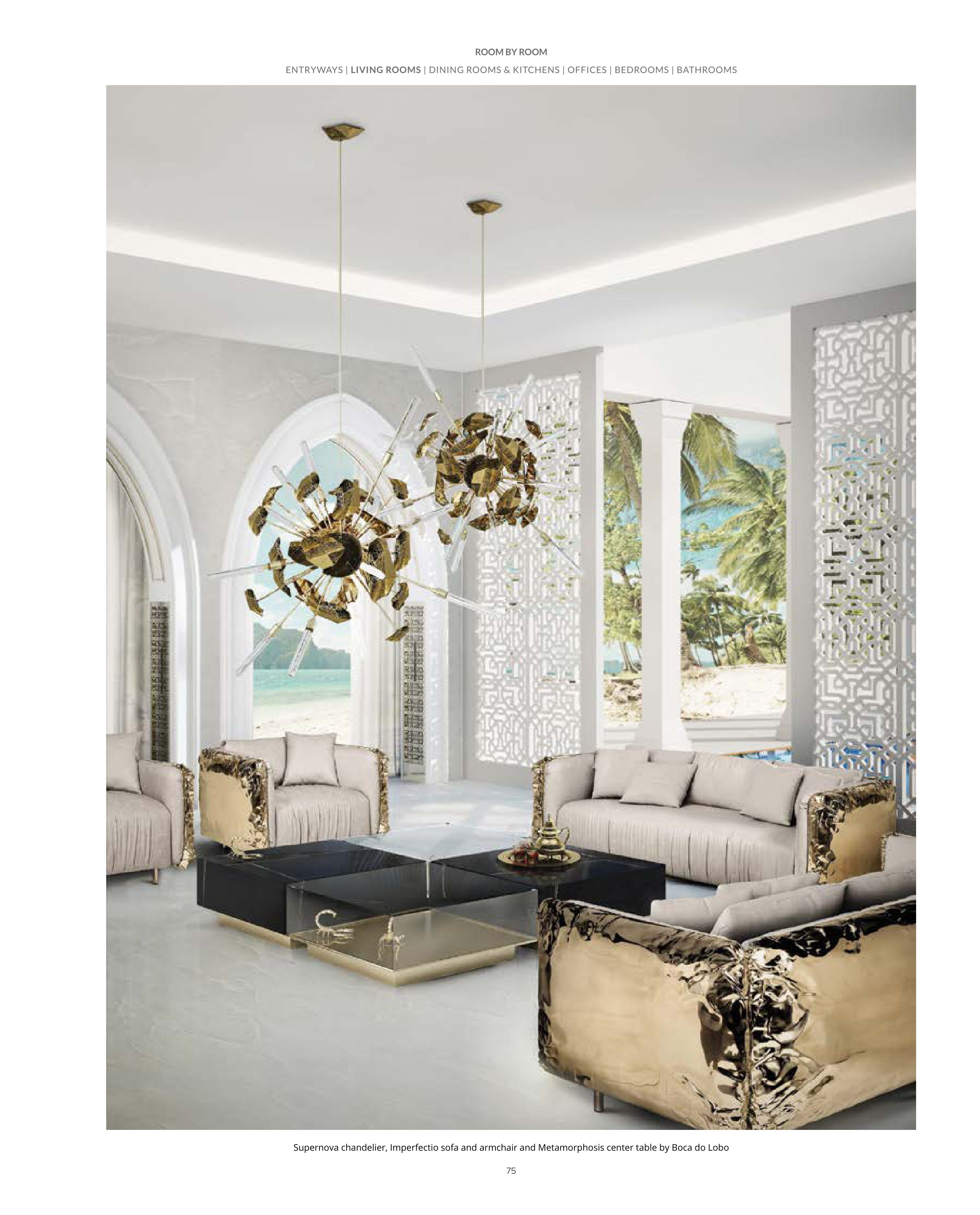 75 Supernova chandelier, Imperfectio sofa and armchair and Metamorphosis center table by Boca do Lobo ENTRYWAYS | LIVING ROOMS | DINING ROOMS & KITCHENS | OFFICES | BEDROOMS | BATHROOMS ROOM BY ROOM