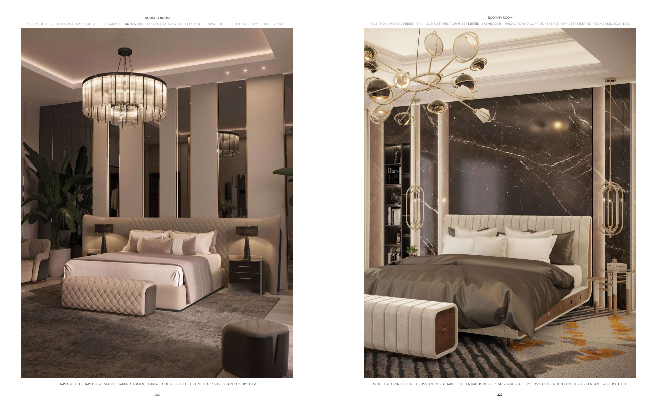 CHARLA XL BED, CHARLA NIGHTSTAND, CHARLA OTTOMAN, CHARLA STOOL, NEEDLE TABLE LAMP, PHARO SUSPENSION LAMP BY LUXXU