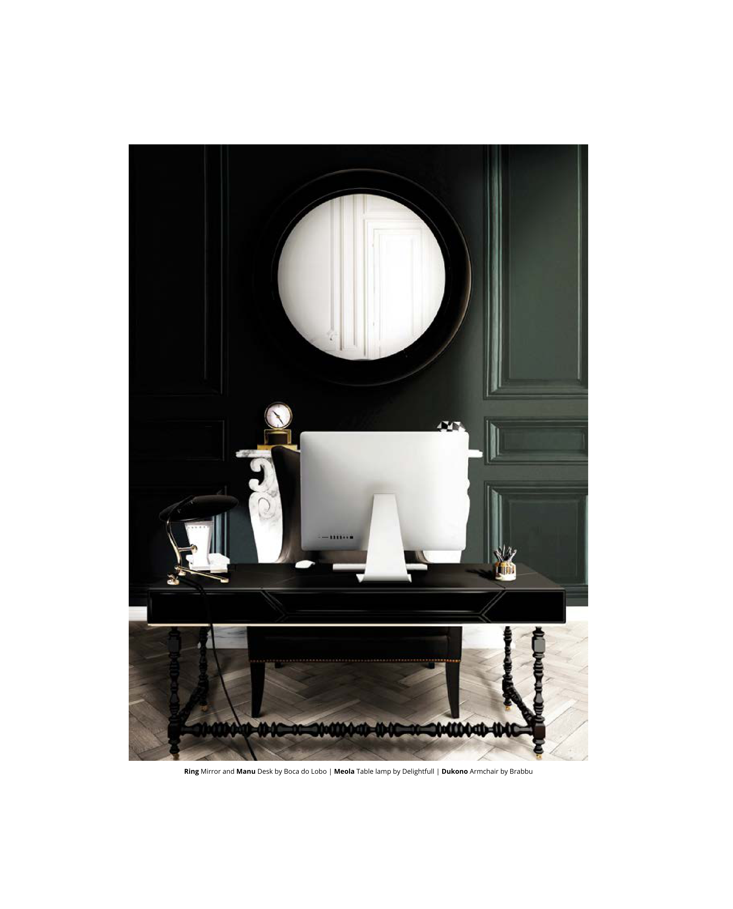 Ring Mirror and Manu Desk by Boca do Lobo | Meola Table lamp by Delightfull | Dukono Armchair by Brabbu