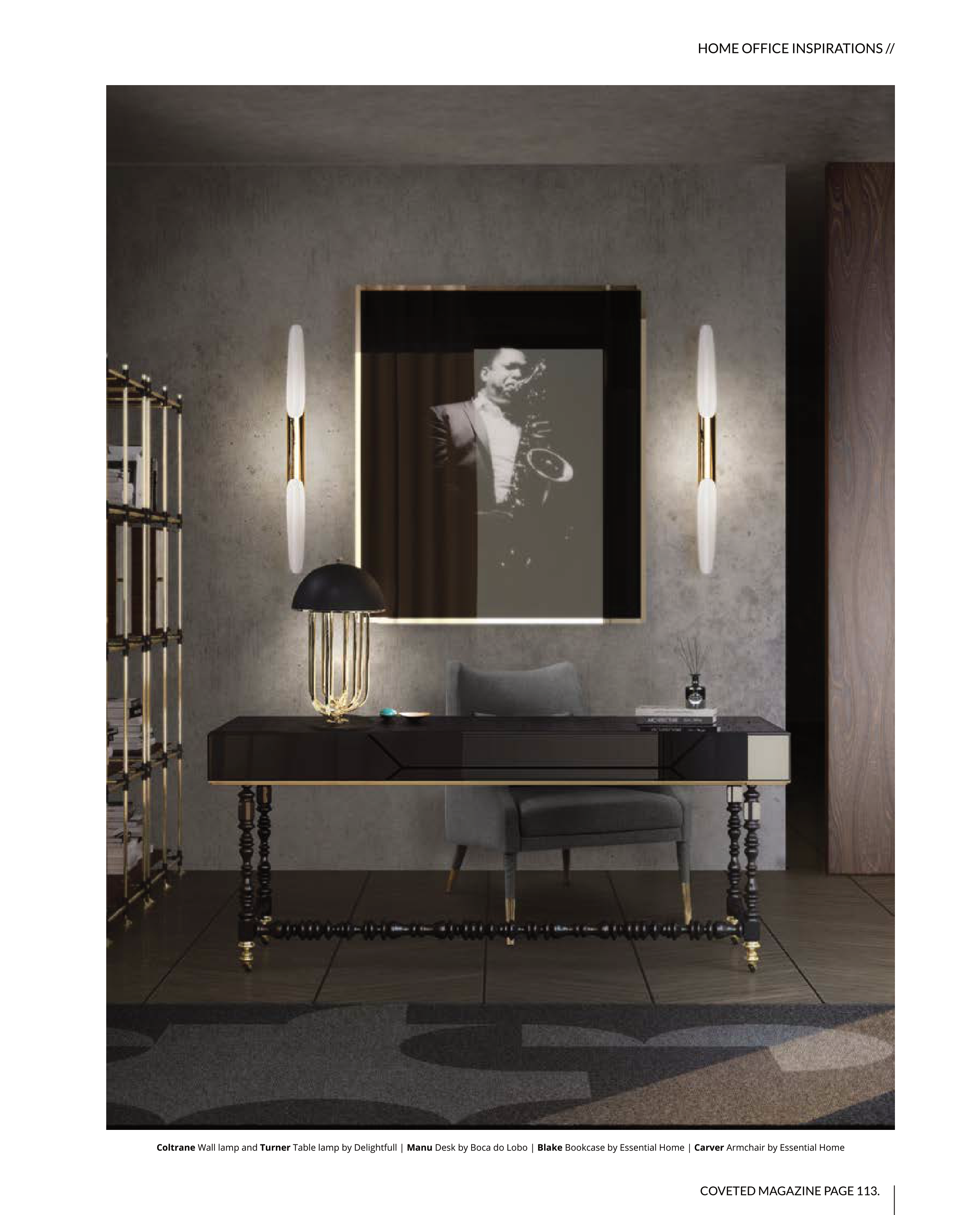 COVETED MAGAZINE PAGE 113. Coltrane Wall lamp and Turner Table lamp by Delightfull | Manu Desk by Boca do Lobo | Blake Bookcase by Essential Home | Carver Armchair by Essential Home HOME OFFICE INSPIRATIONS //