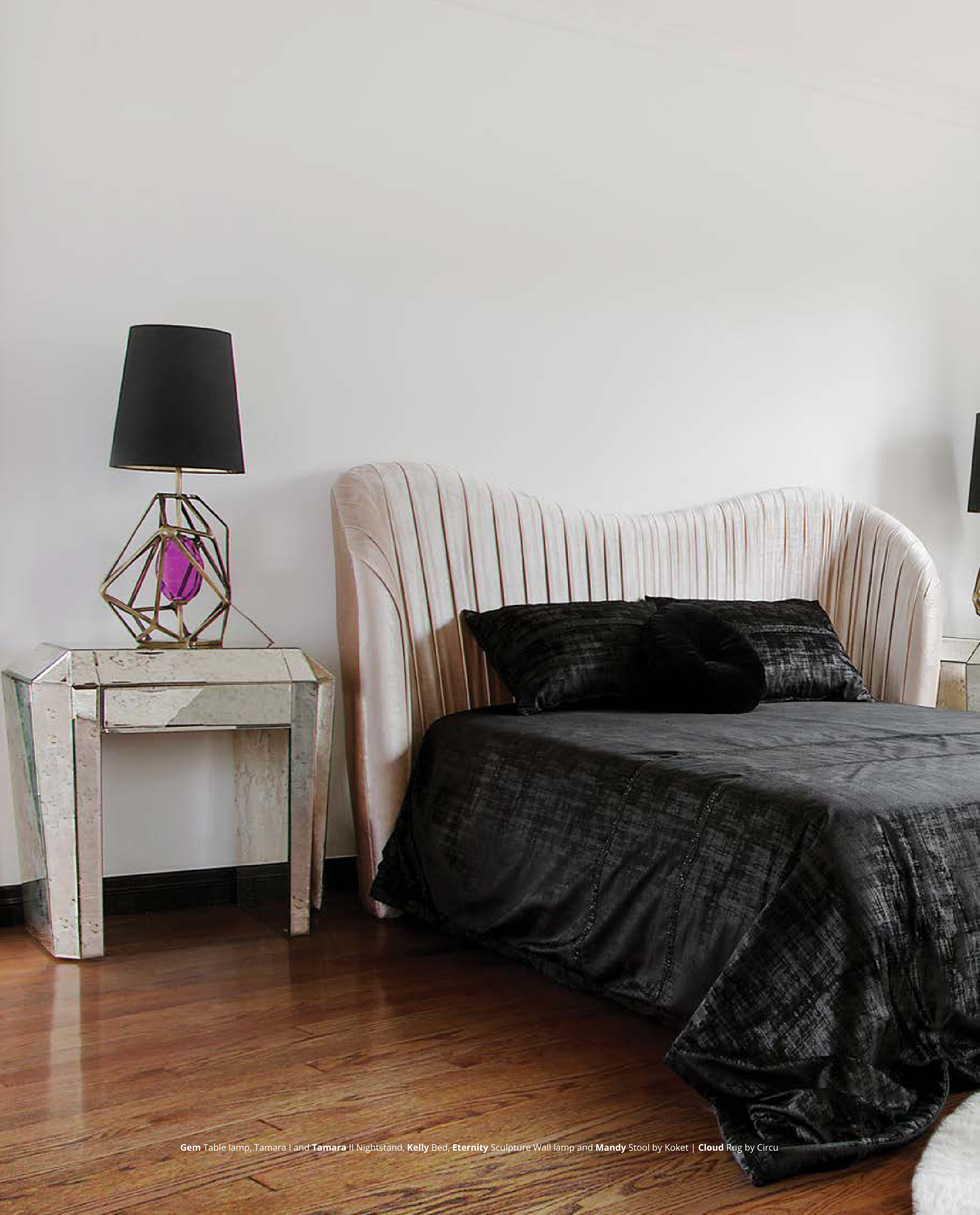 Gem Table lamp, Tamara I and Tamara II Nightstand, Kelly Bed, Eternity Sculpture Wall lamp and Mandy Stool by Koket | Cloud Rug by Circu