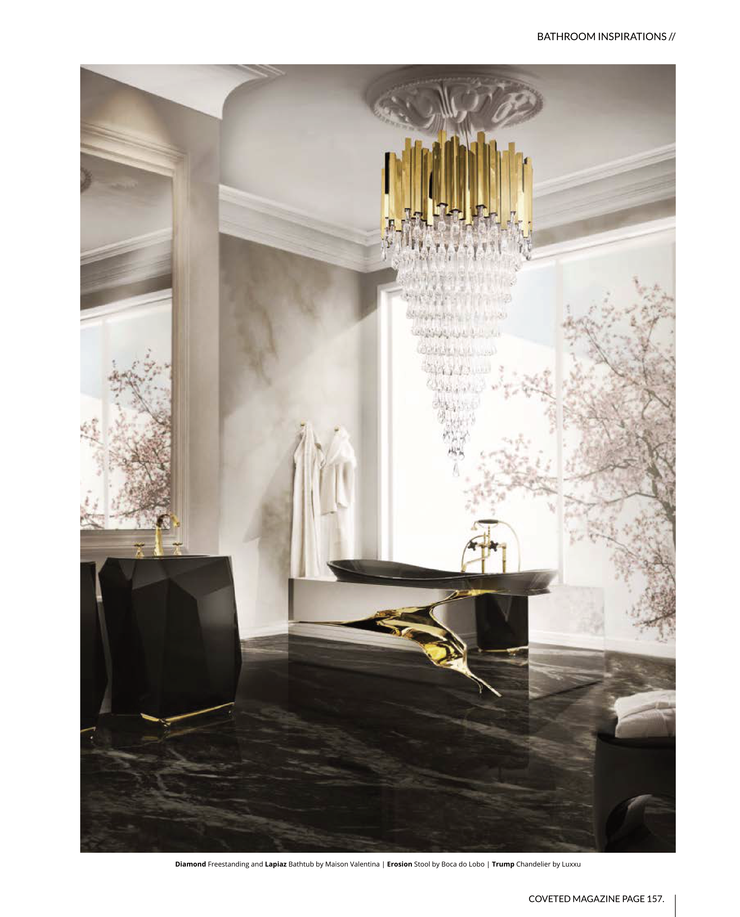 COVETED MAGAZINE PAGE 157. Diamond Freestanding and Lapiaz Bathtub by Maison Valentina | Erosion Stool by Boca do Lobo | Trump Chandelier by Luxxu BATHROOM INSPIRATIONS //