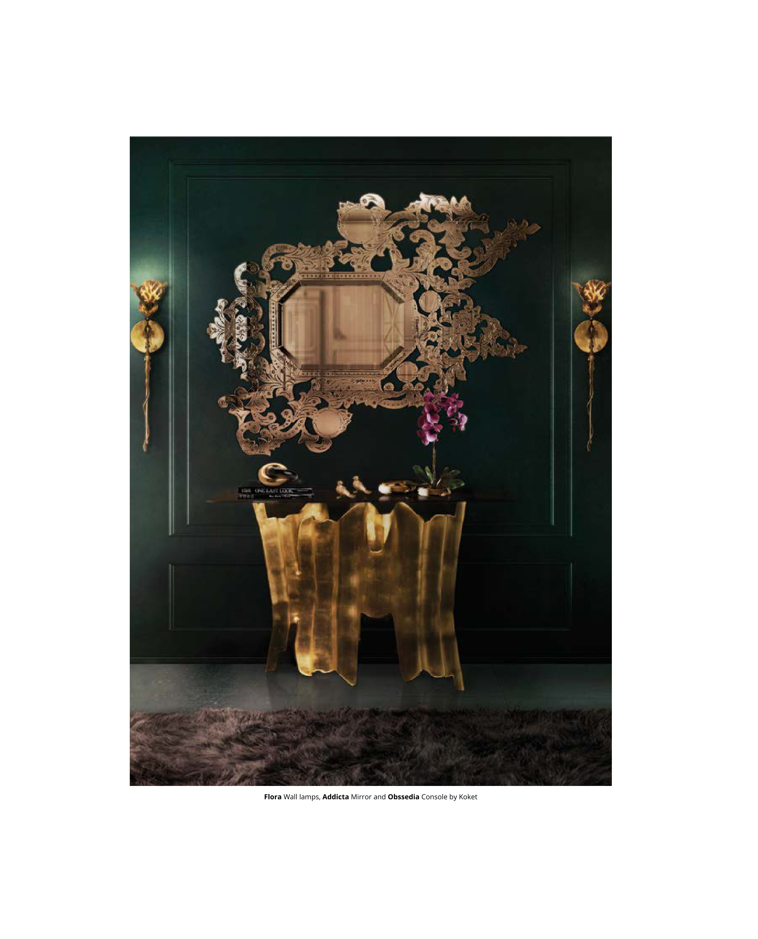 Flora Wall lamps, Addicta Mirror and Obssedia Console by Koket