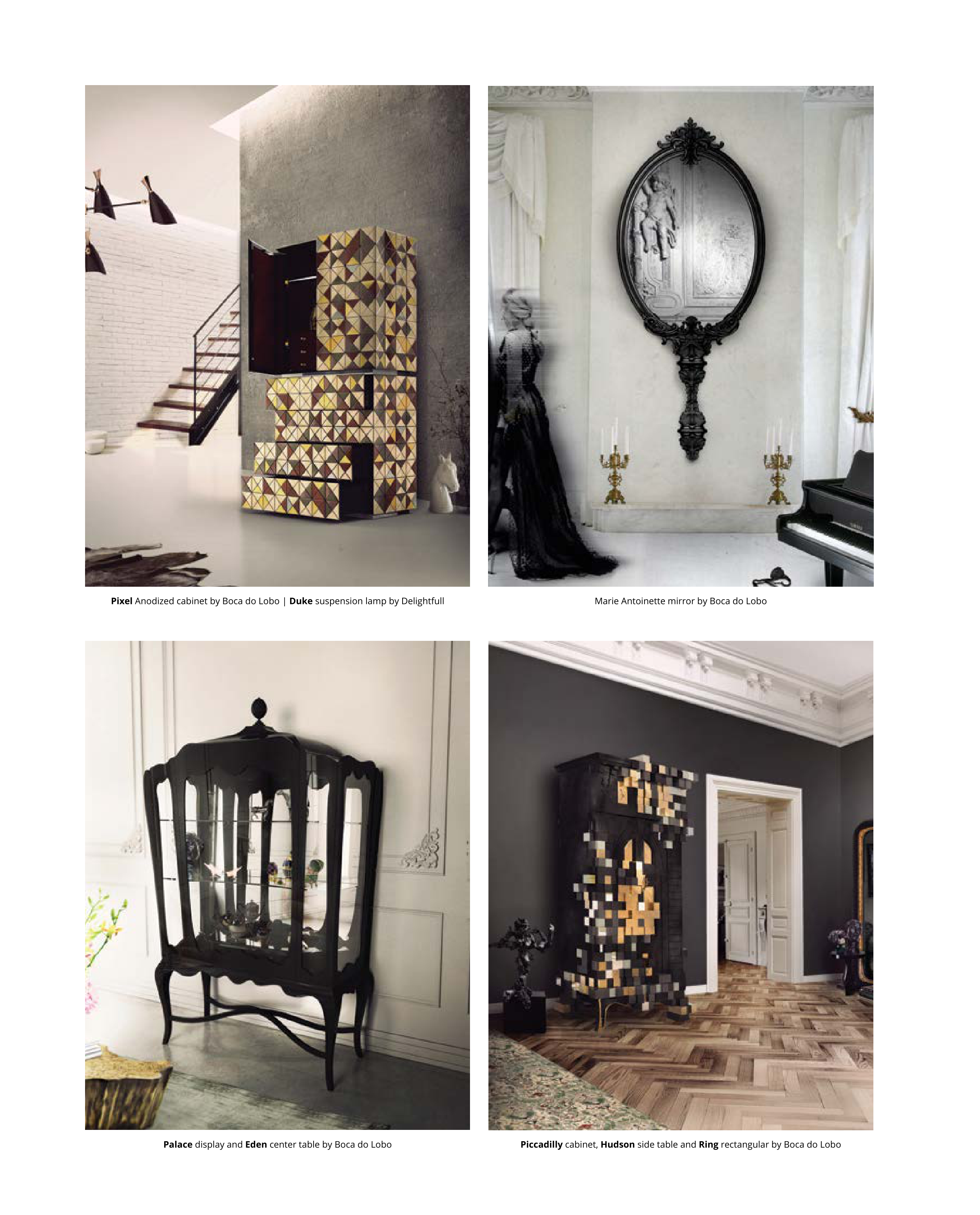 Piccadilly cabinet, Hudson side table and Ring rectangular by Boca do Lobo Palace display and Eden center table by Boca do Lobo Marie Antoinette mirror by Boca do Lobo Pixel Anodized cabinet by Boca do Lobo | Duke suspension lamp by Delightfull