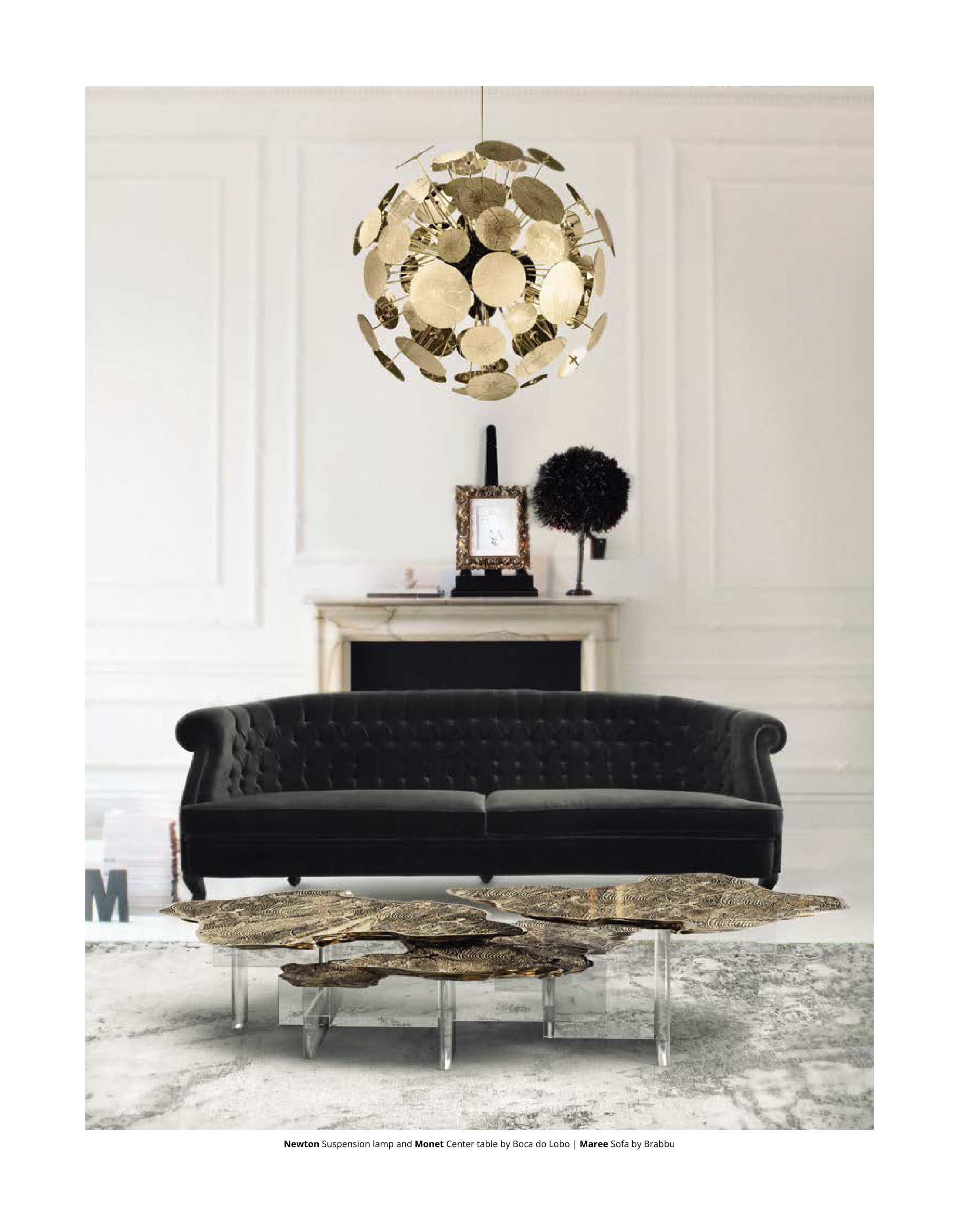Newton Suspension lamp and Monet Center table by Boca do Lobo | Maree Sofa by Brabbu