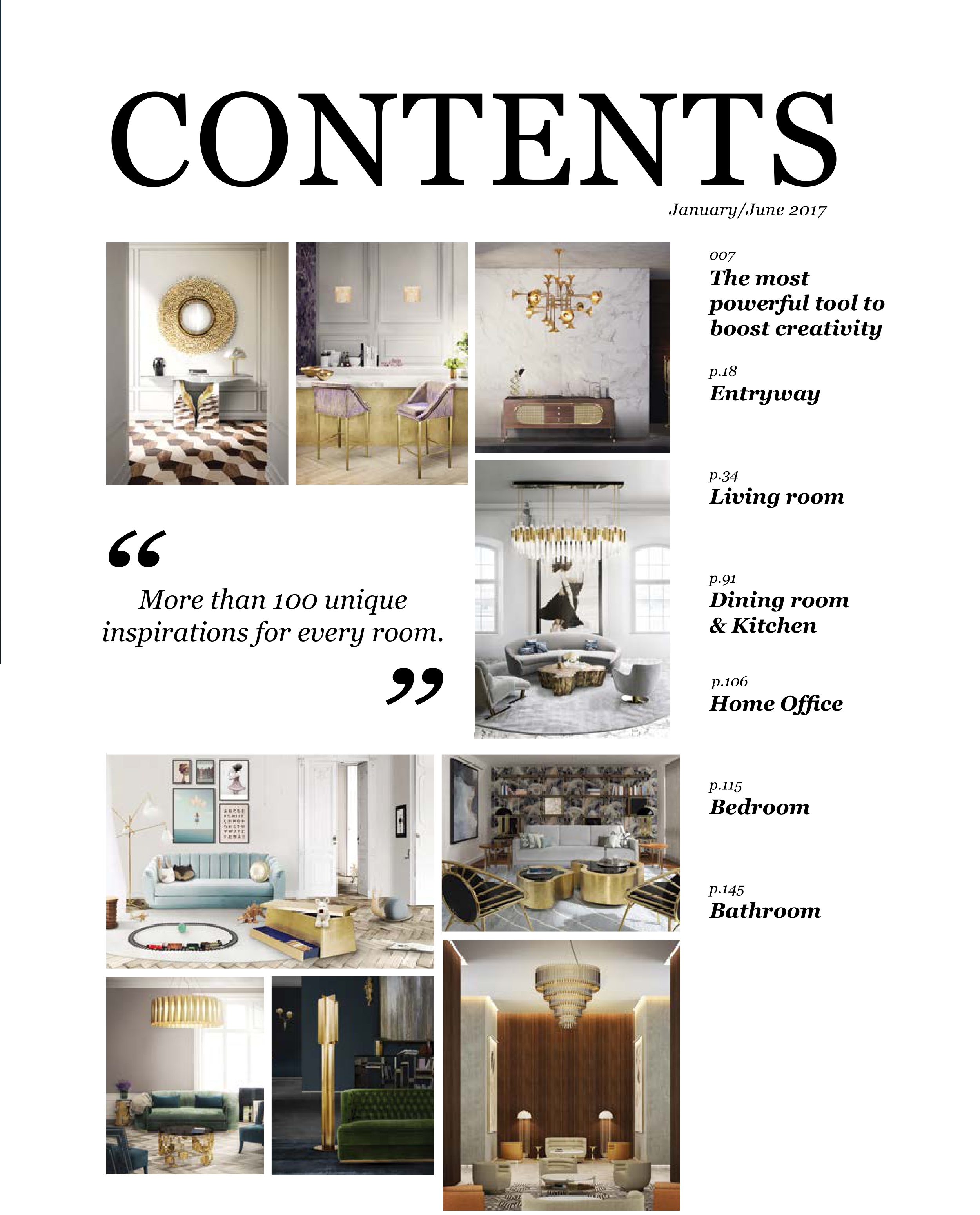 p.115 Dining room & Kitchen p.91 Bathroom p.145 Entryway p.18 Home Office p.106 CONTENTS January/June 2017 007 The most powerful tool to boost creativity More than 100 unique inspirations for every room.