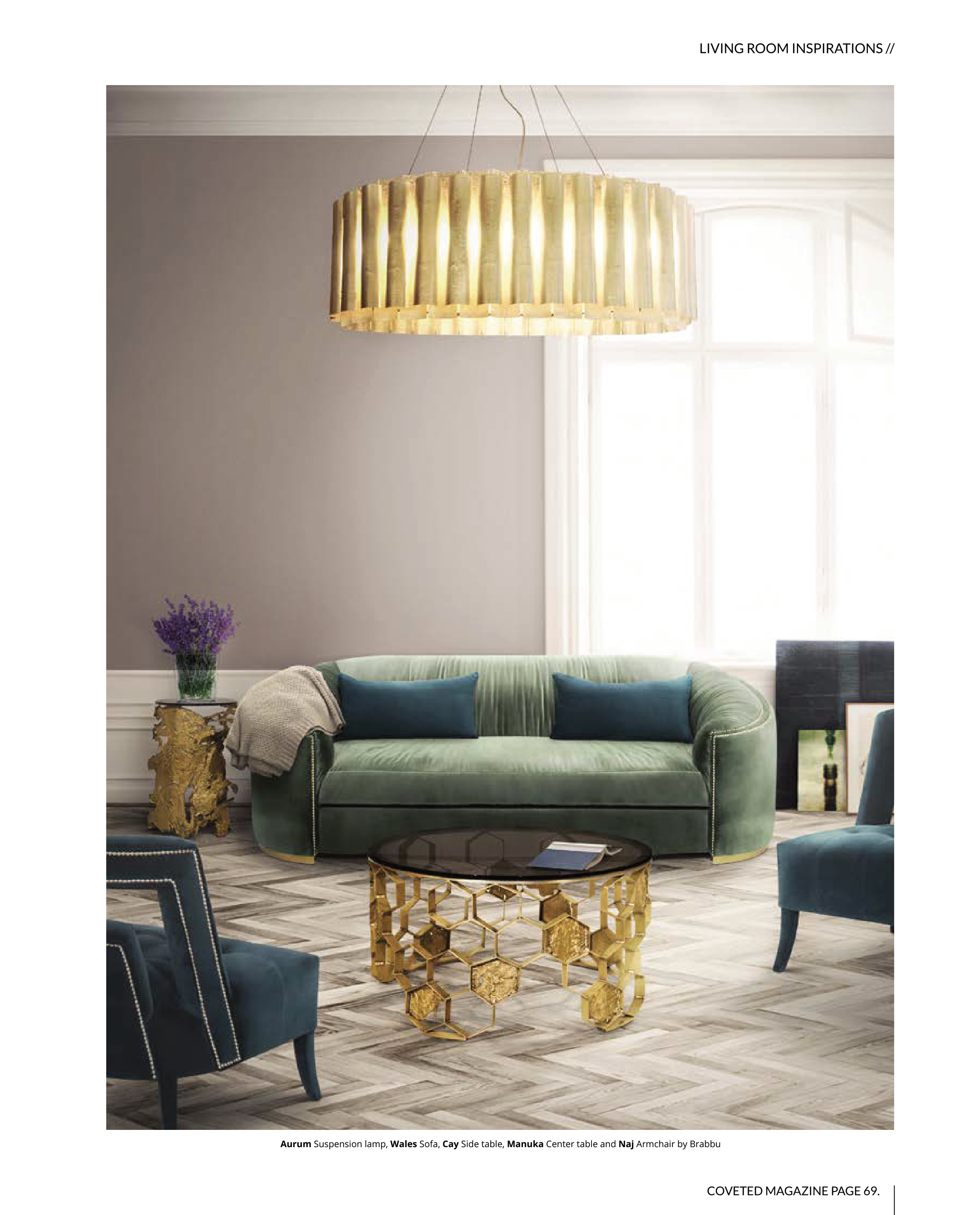 COVETED MAGAZINE PAGE 69. Aurum Suspension lamp, Wales Sofa, Cay Side table, Manuka Center table and Naj Armchair by Brabbu LIVING ROOM INSPIRATIONS //