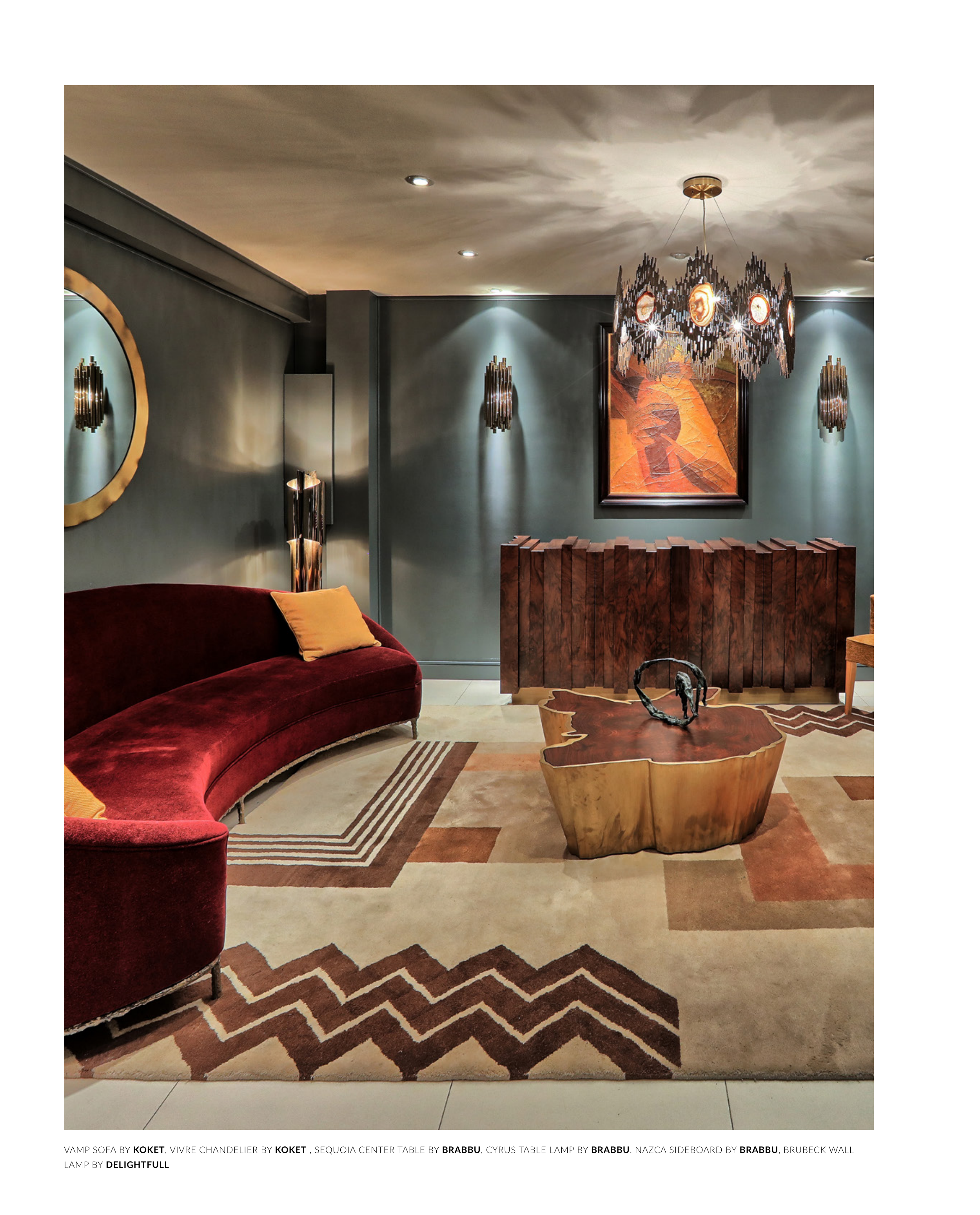 VAMP SOFA BY KOKET, VIVRE CHANDELIER BY KOKET , SEQUOIA CENTER TABLE BY BRABBU, CYRUS TABLE LAMP BY BRABBU, NAZCA SIDEBOARD BY BRABBU, BRUBECK WALL LAMP BY DELIGHTFULL