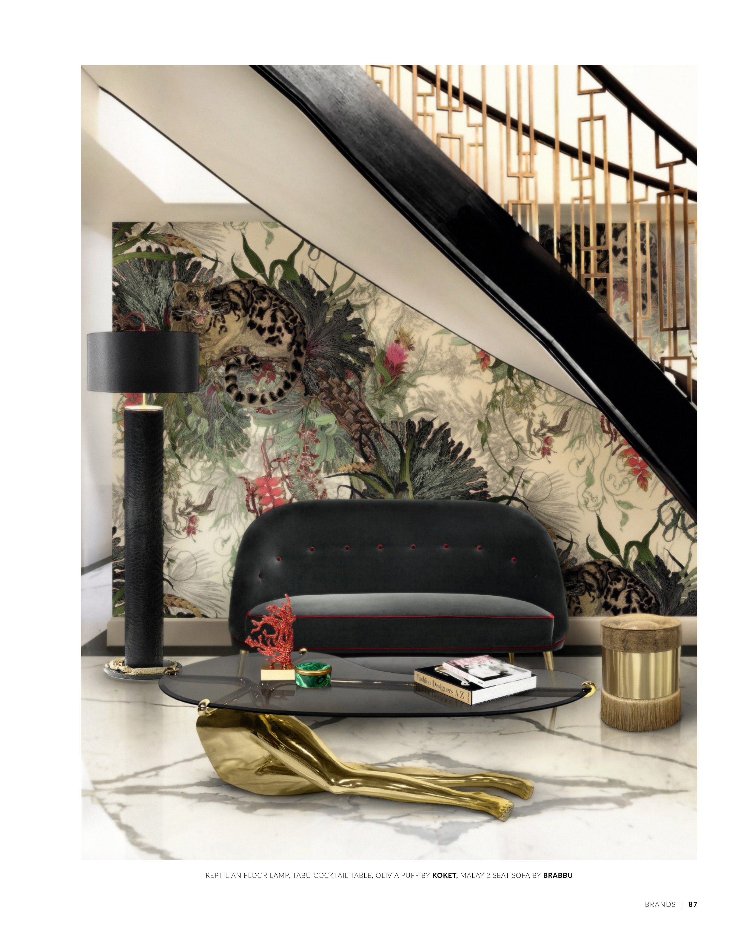 REPTILIAN FLOOR LAMP, TABU COCKTAIL TABLE, OLIVIA PUFF BY KOKET, MALAY 2 SEAT SOFA BY BRABBU