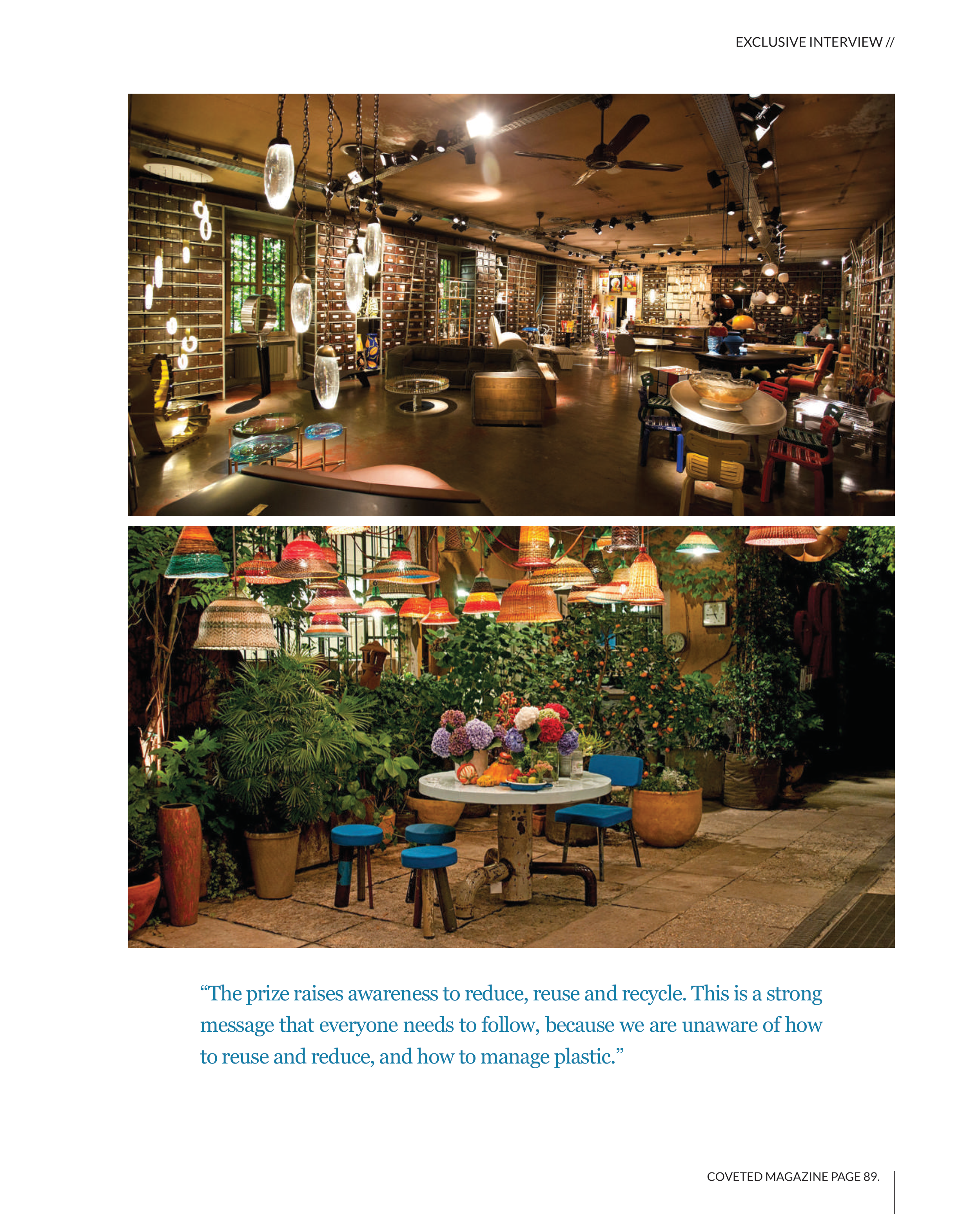COVETED MAGAZINE PAGE 89. EXCLUSIVE INTERVIEW // “The prize raises awareness to reduce, reuse and recycle. This is a strong message that everyone needs to follow, because we are unaware of how to reuse and reduce, and how to manage plastic.”