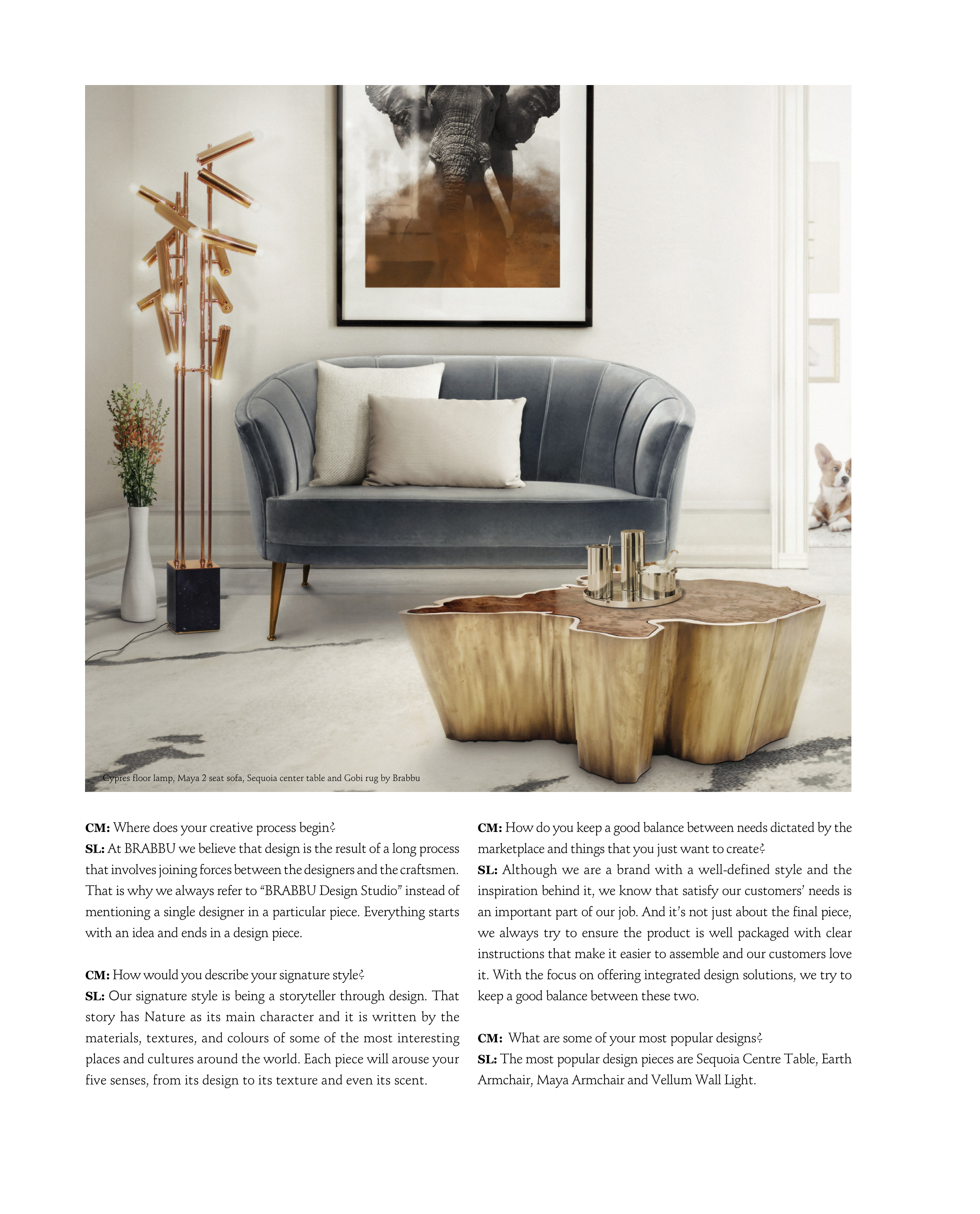 Cypres floor lamp, Maya 2 seat sofa, Sequoia center table and Gobi rug by Brabbu