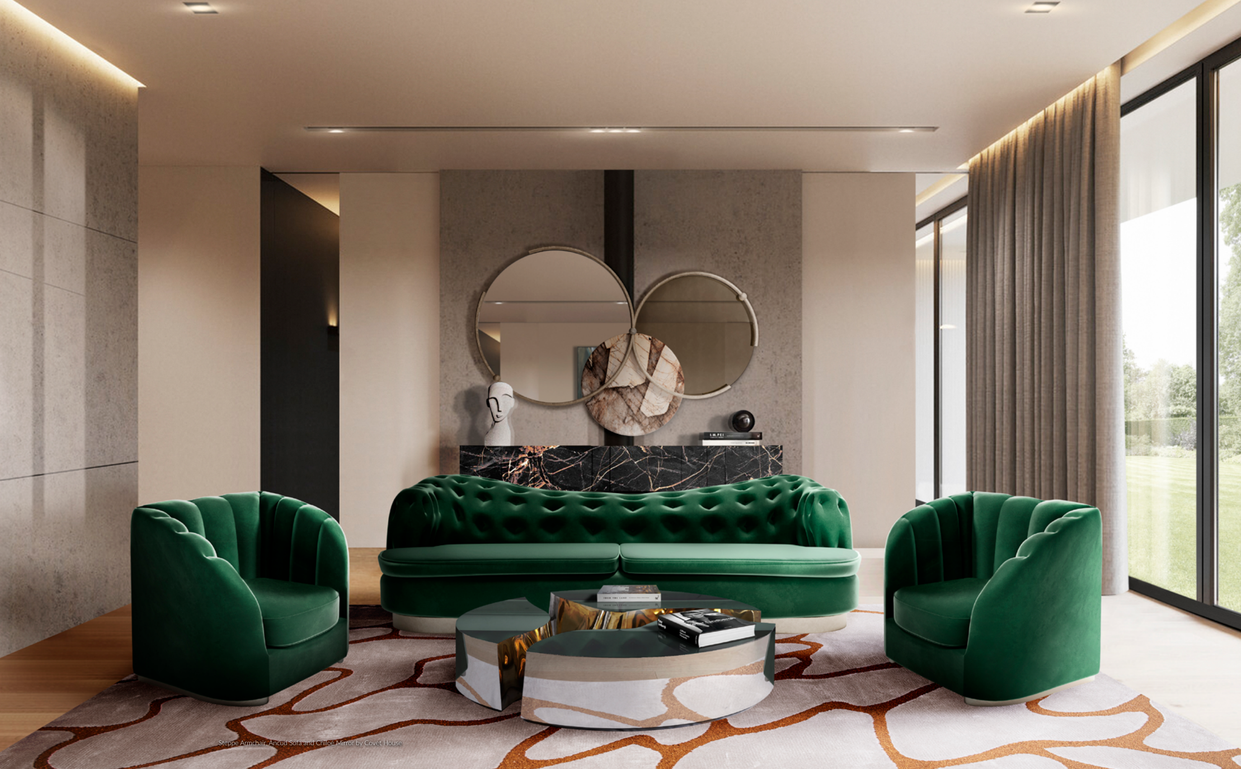 Steppe Armchair, Ancud Sofa and Chiloé Mirror by Covet House