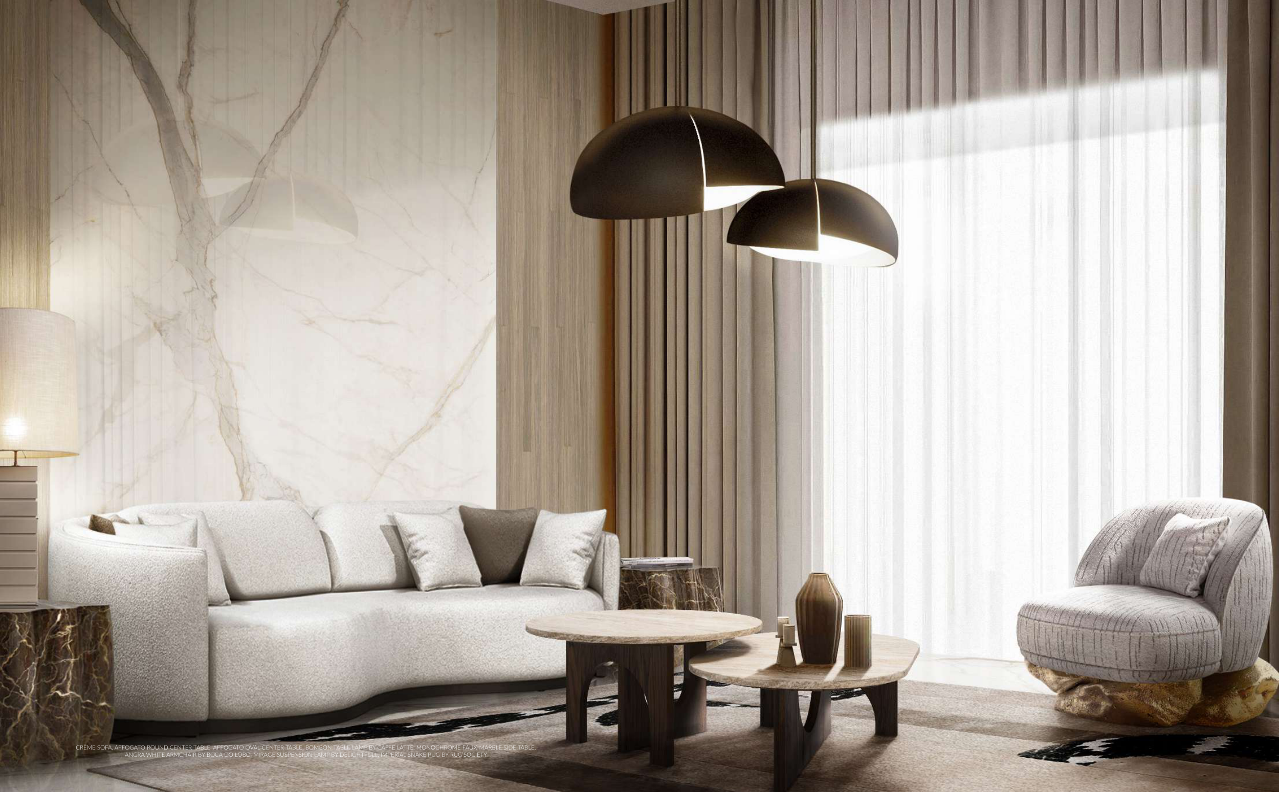 CRÈME SOFA, AFFOGATO ROUND CENTER TABLE, AFFOGATO OVAL CENTER TABLE, BOMBON TABLE LAMP BY CAFFE LATTE, MONOCHROME FAUX-MARBLE SIDE TABLE,