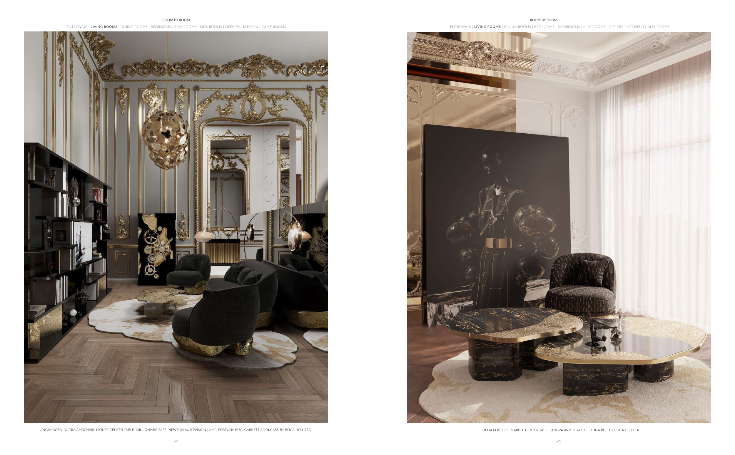 ANGRA SOFA, ANGRA AMRCHAIR, MONET CENTER TABLE, MILLIONAIRE SAFE, NEWTON SUSPENSION LAMP, FORTUNA RUG, GARRETT BOOKCASE BY BOCA DO LOBO