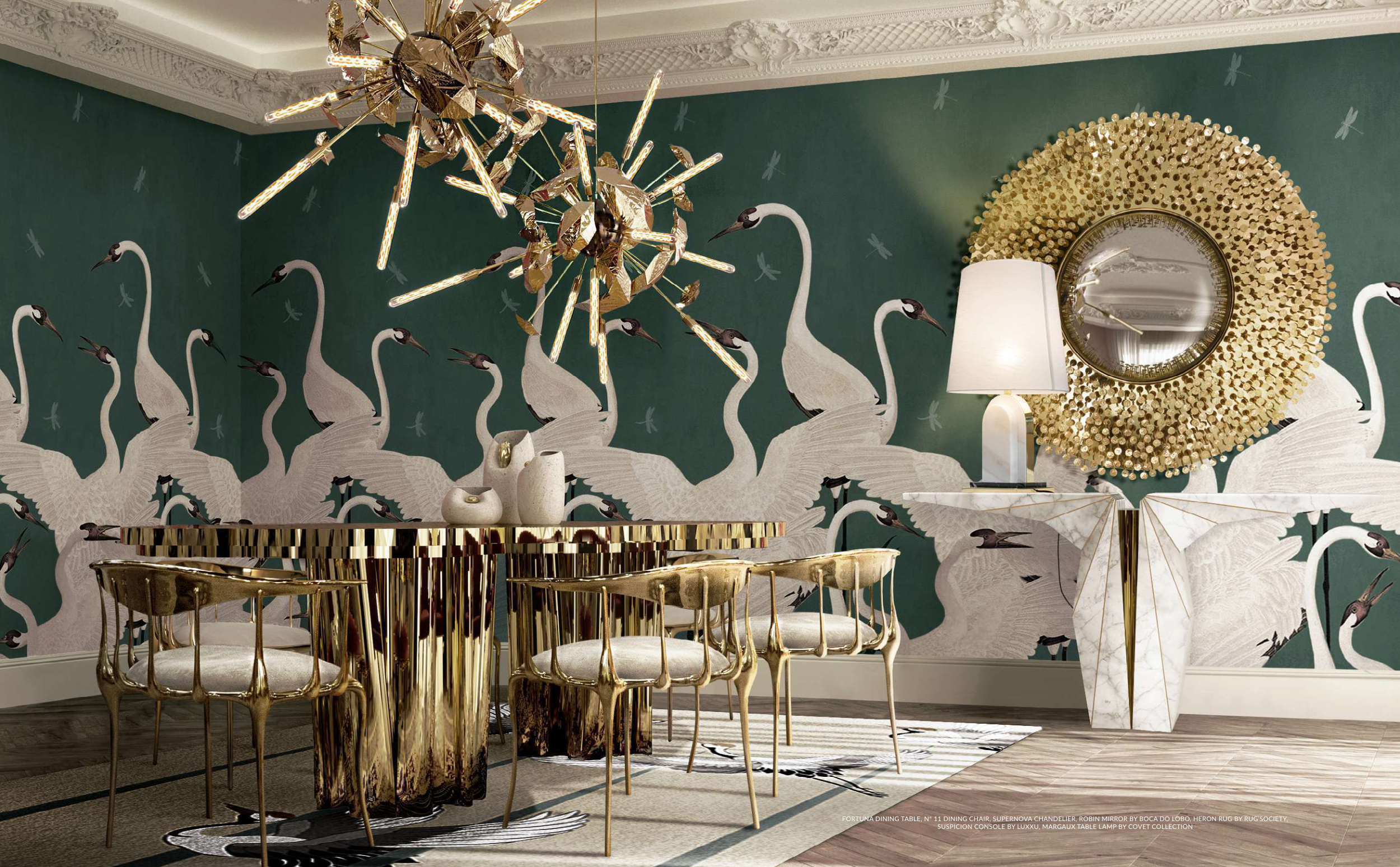 FORTUNA DINING TABLE, Nº 11 DINING CHAIR, SUPERNOVA CHANDELIER, ROBIN MIRROR BY BOCA DO LOBO, HERON RUG BY RUG’SOCIETY,