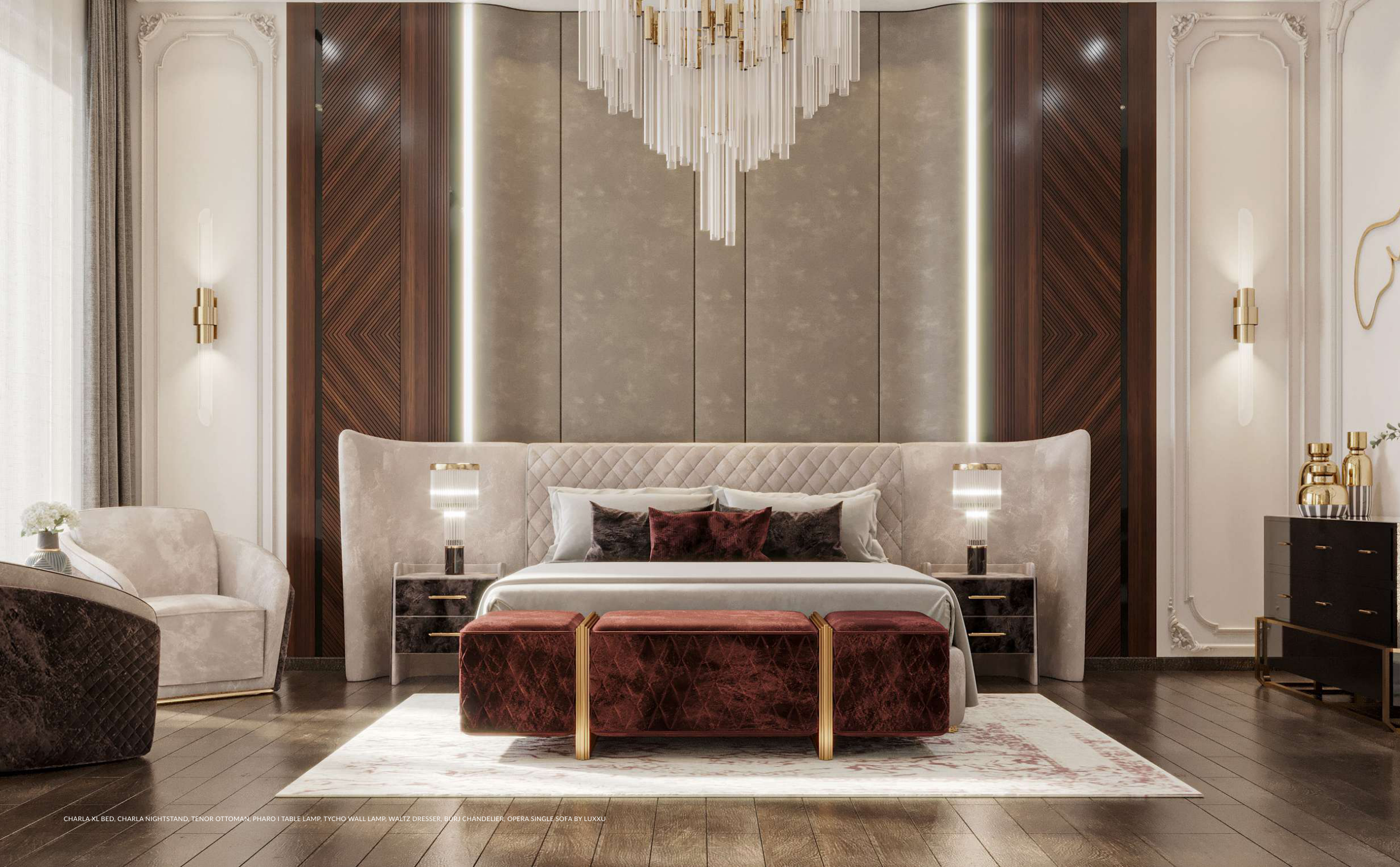 CHARLA XL BED, CHARLA NIGHTSTAND, TENOR OTTOMAN, PHARO I TABLE LAMP, TYCHO WALL LAMP, WALTZ DRESSER, BURJ CHANDELIER, OPERA SINGLE SOFA BY LUXXU