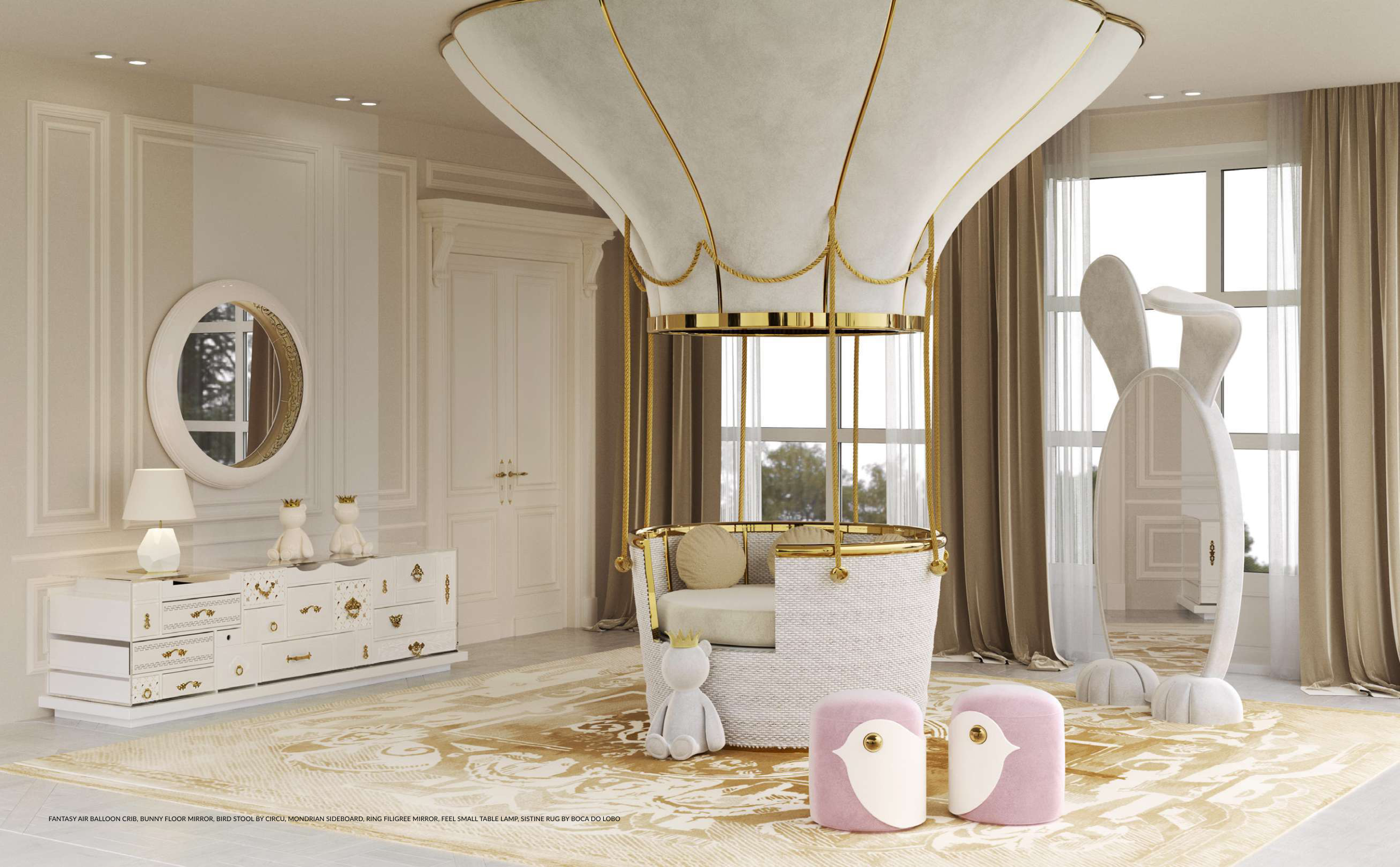 FANTASY AIR BALLOON CRIB, BUNNY FLOOR MIRROR, BIRD STOOL BY CIRCU, MONDRIAN SIDEBOARD, RING FILIGREE MIRROR, FEEL SMALL TABLE LAMP, SISTINE RUG BY BOCA DO LOBO
