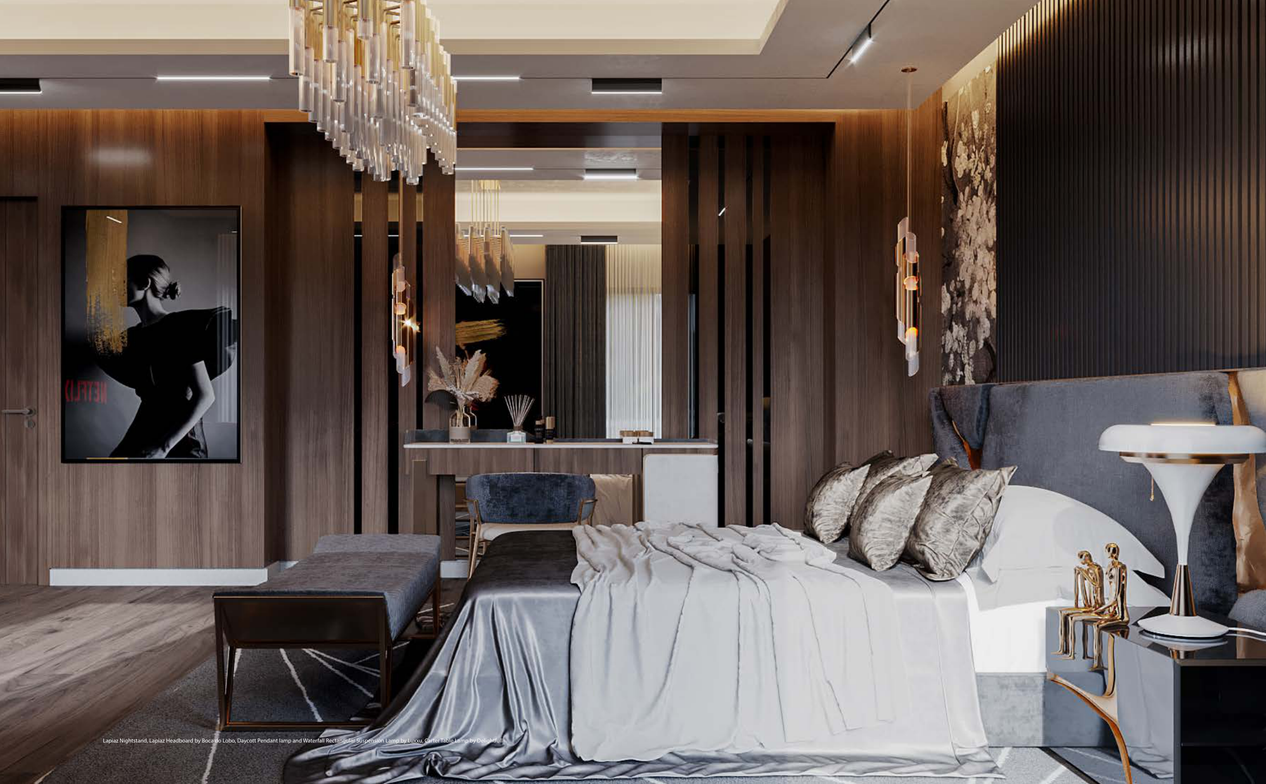 Lapiaz Nightstand, Lapiaz Headboard by Boca do Lobo, Daycott Pendant lamp and Waterfall Rectangular Suspension Lamp by Luxxu, Carter Table Lamp by Delightfull