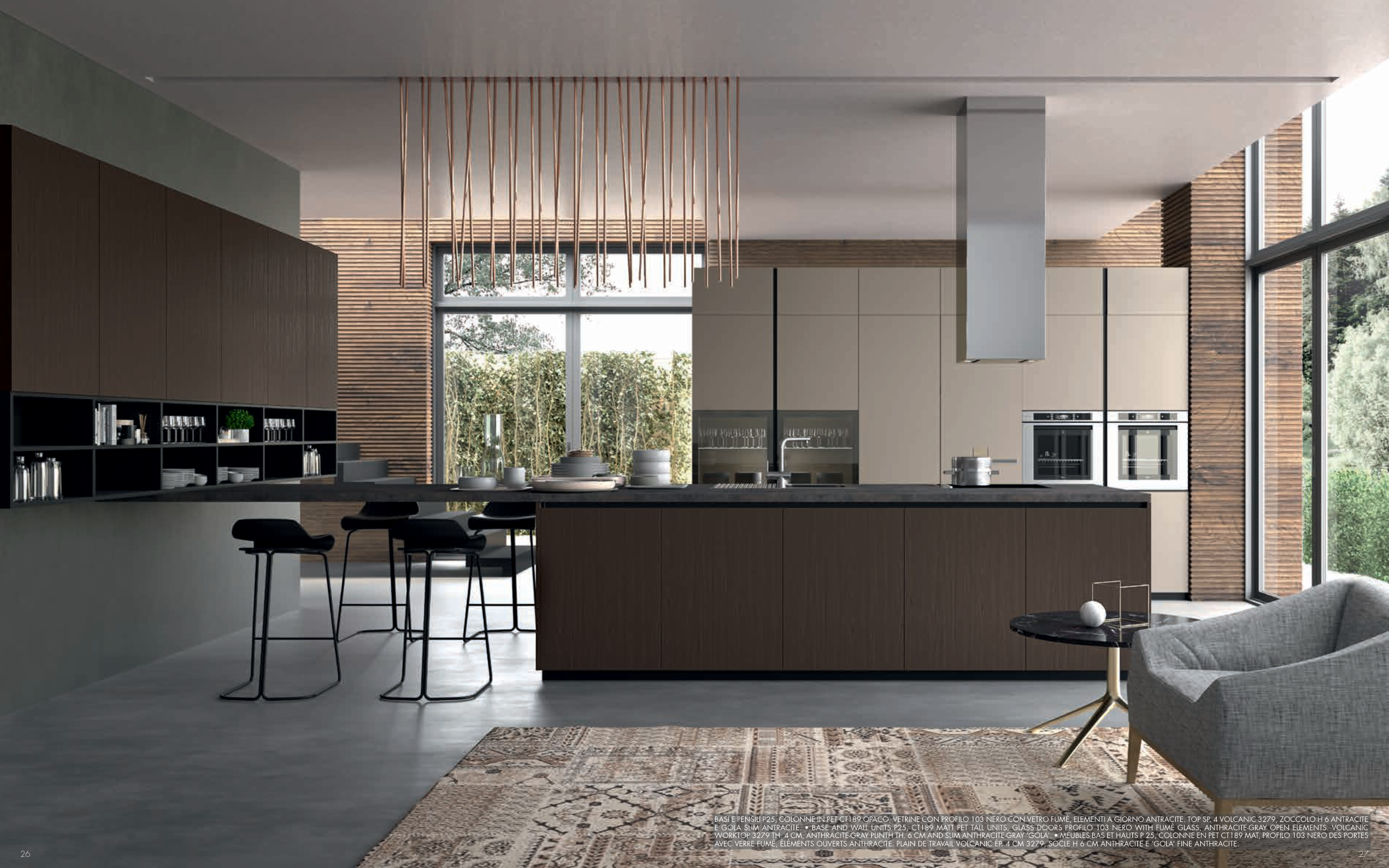 AVEC VERRE FUMÉ, ÉLÉMENTS OUVERTS ANTHRACITE. PLAIN DE TRAVAIL VOLCANIC ÉP. 4 CM 3279, SOCLE H 6 CM ANTHRACITE E ‘GOLA’ FINE ANTHRACITE.