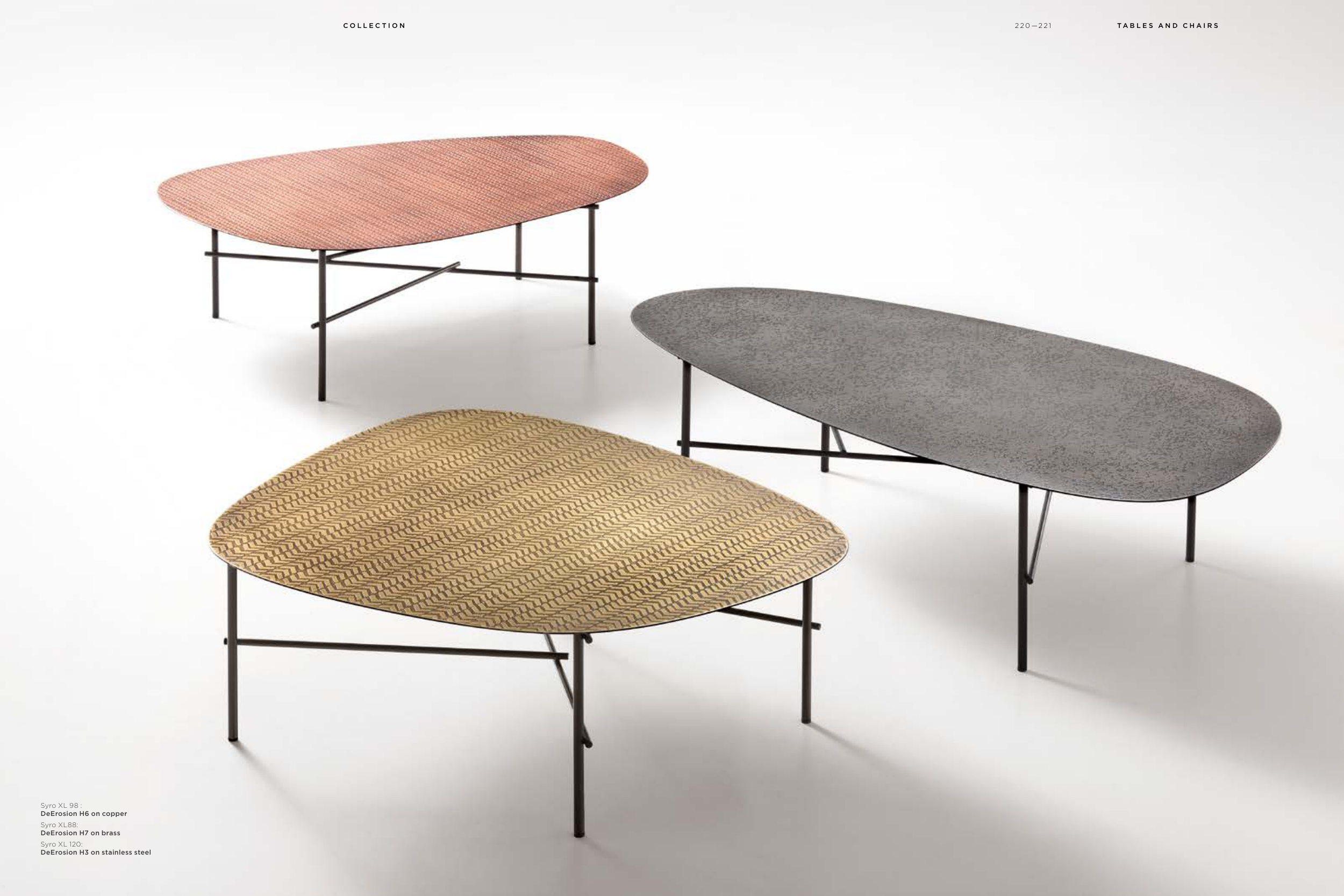Syro XL 98 : DeErosion H6 on copper Syro XL88: DeErosion H7 on brass Syro XL 120: DeErosion H3 on stainless steel C O L L E C T I O N 2 2 0 —2 2 1 T A B L E S A N D C H A I R S