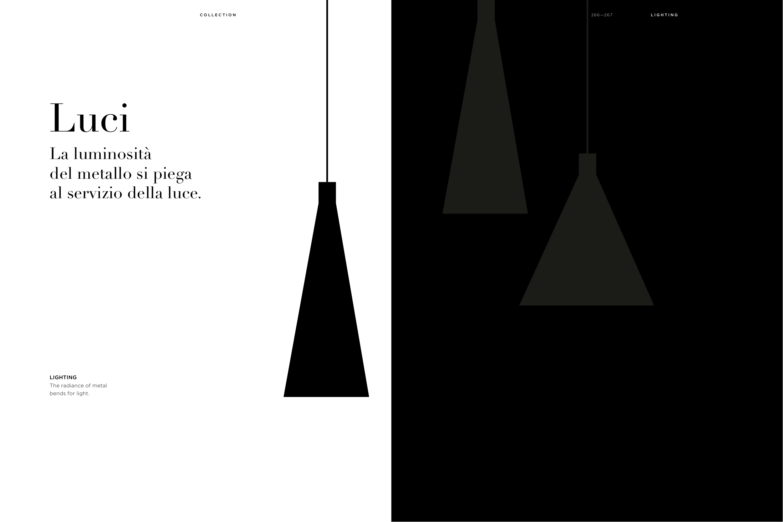 Luci La luminosità del metallo si piega al servizio della luce. LIGHTING The radiance of metal bends for light. 266 —267 C O L L E C T I O N L I G H T I N G