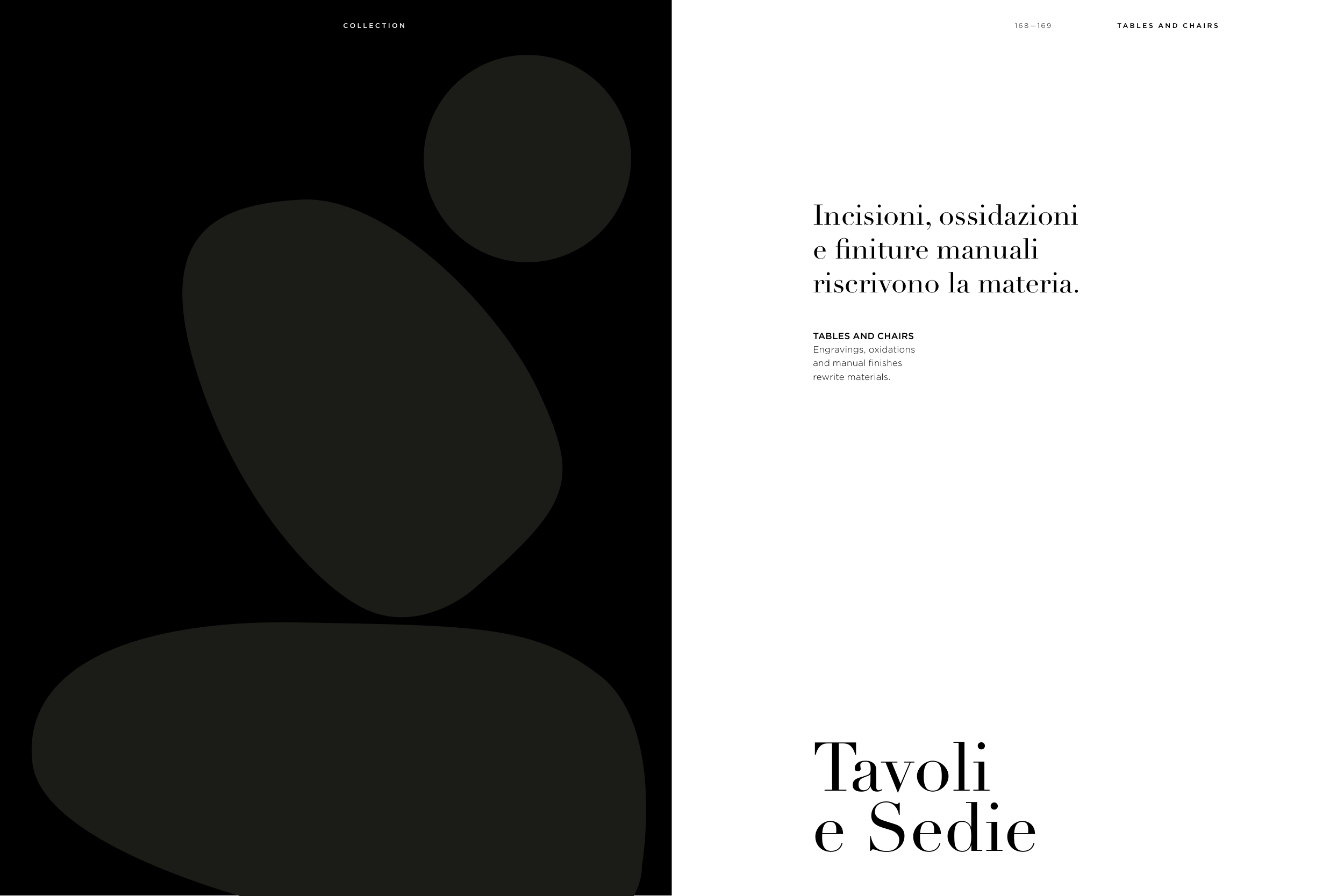 Tavoli e Sedie Incisioni, ossidazioni e finiture manuali riscrivono la materia. TABLES AND CHAIRS Engravings, oxidations and manual finishes rewrite materials. 1 6 8 — 1 6 9 C O L L E C T I O N T A B L E S A N D C H A I R S