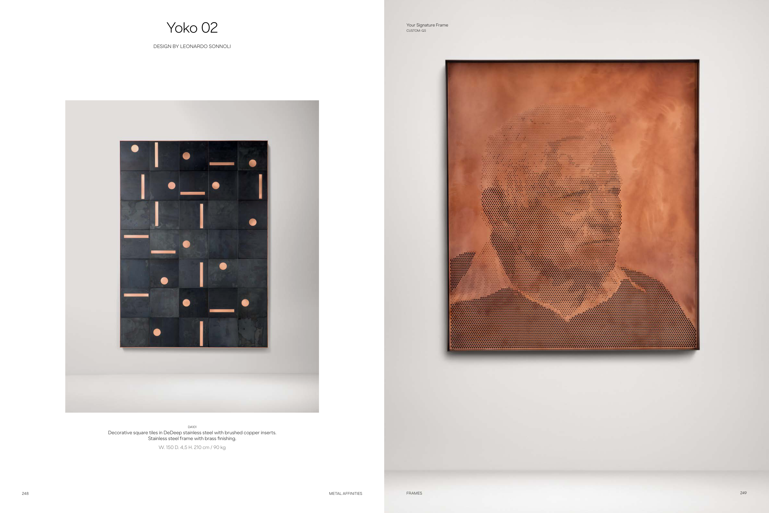 248 METAL AFFINITIES DA101 Decorative square tiles in DeDeep stainless steel with brushed copper inserts. Stainless steel frame with brass finishing. W. 150 D. 4,5 H. 210 cm / 90 kg DESIGN BY LEONARDO SONNOLI Yoko 02 Your Signature Frame CUSTOM-G5 249 FRAMES