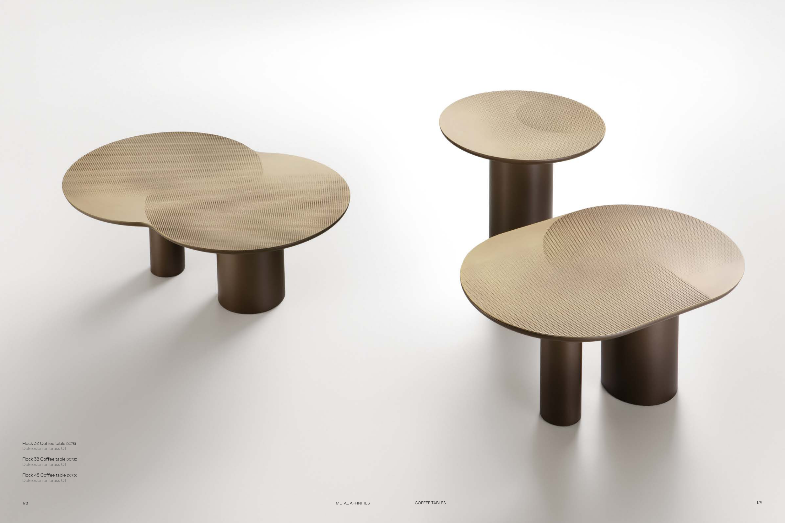 Flock 32 Coffee table DC731 DeErosion on brass OT Flock 38 Coffee table DC732 DeErosion on brass OT Flock 45 Coffee table DC730 DeErosion on brass OT 179 COFFEE TABLES 178 METAL AFFINITIES