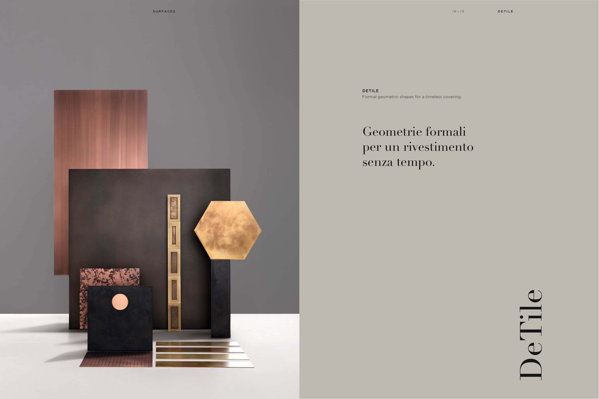 S U R F A C E S DeTile DETILE Formal geometric shapes for a timeless covering. Geometrie formali per un rivestimento senza tempo. 1 8 — 1 9 D E T I L E