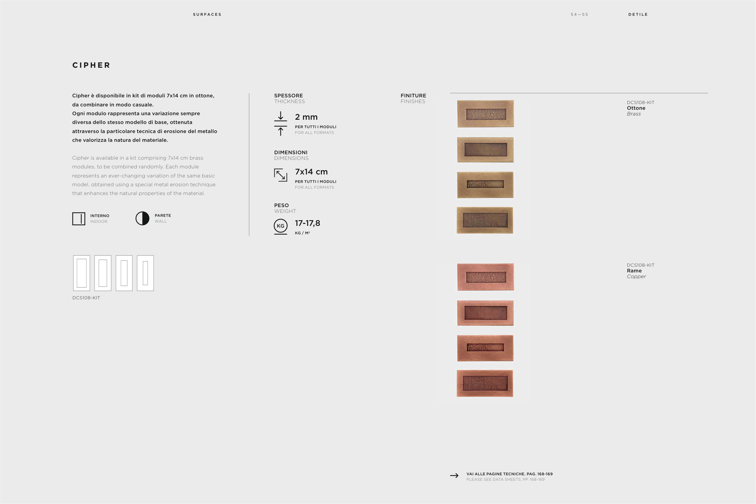 Cipher è disponibile in kit di moduli 7x14 cm in ottone,