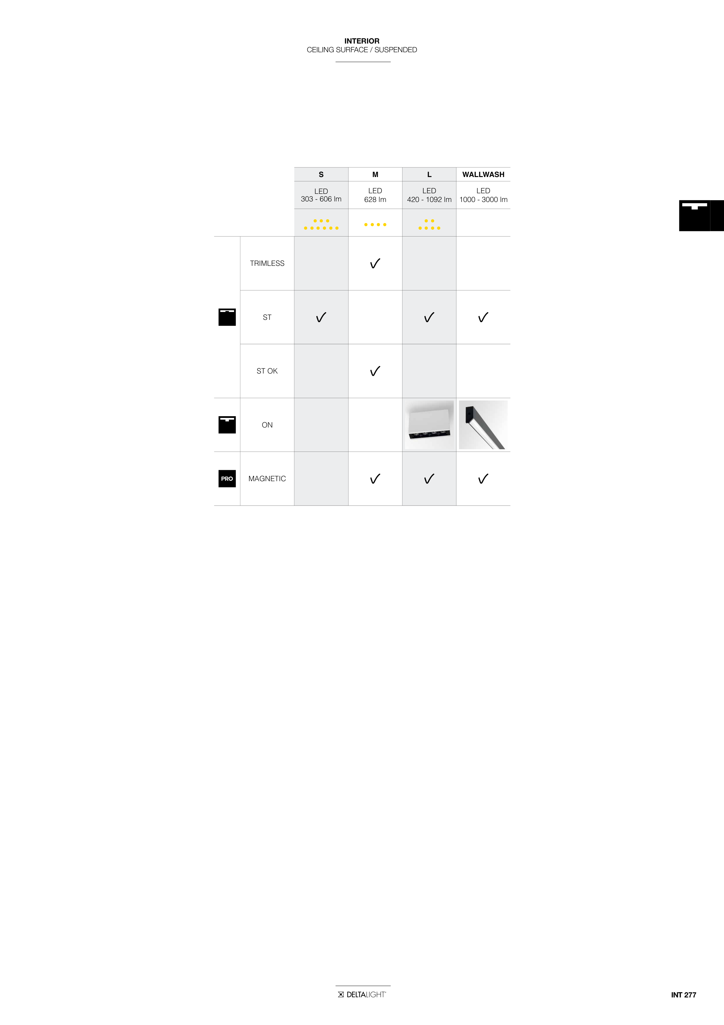 INTERIOR CEILING SURFACE / SUSPENDED INT 277 S M L WALLWASH LED 303 - 606 lm LED 628 lm LED 420 - 1092 lm LED 1000 - 3000 lm • • • • • • • • • • • • • • • • • • • TRIMLESS ST ST OK ON MAGNETIC