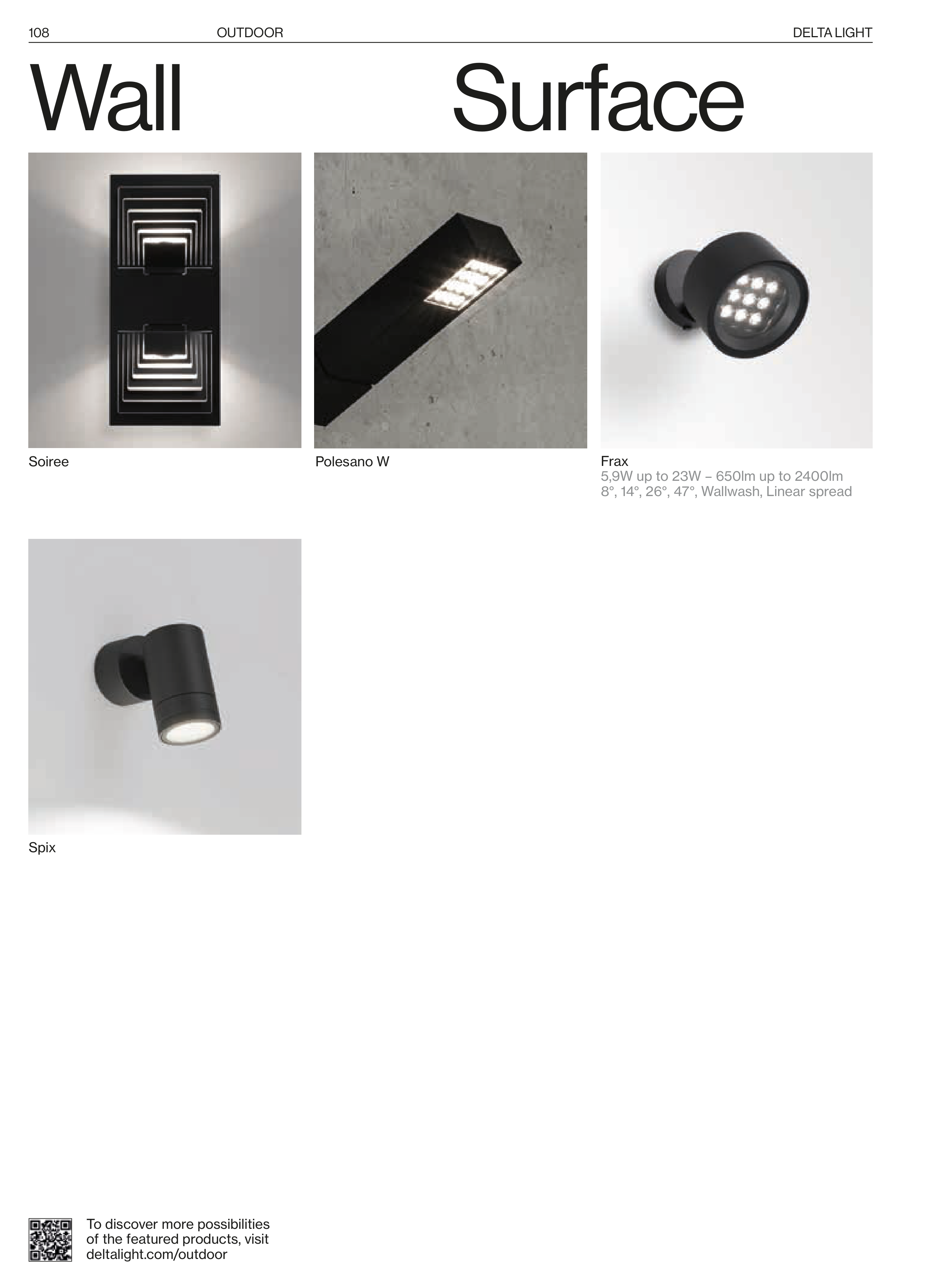 Surface Wall Frax 5,9W up to 23W – 650lm up to 2400lm 8°, 14°, 26°, 47°, Wallwash, Linear spread Polesano W Soiree Spix To discover more possibilities of the featured products, visit deltalight.com/outdoor 108