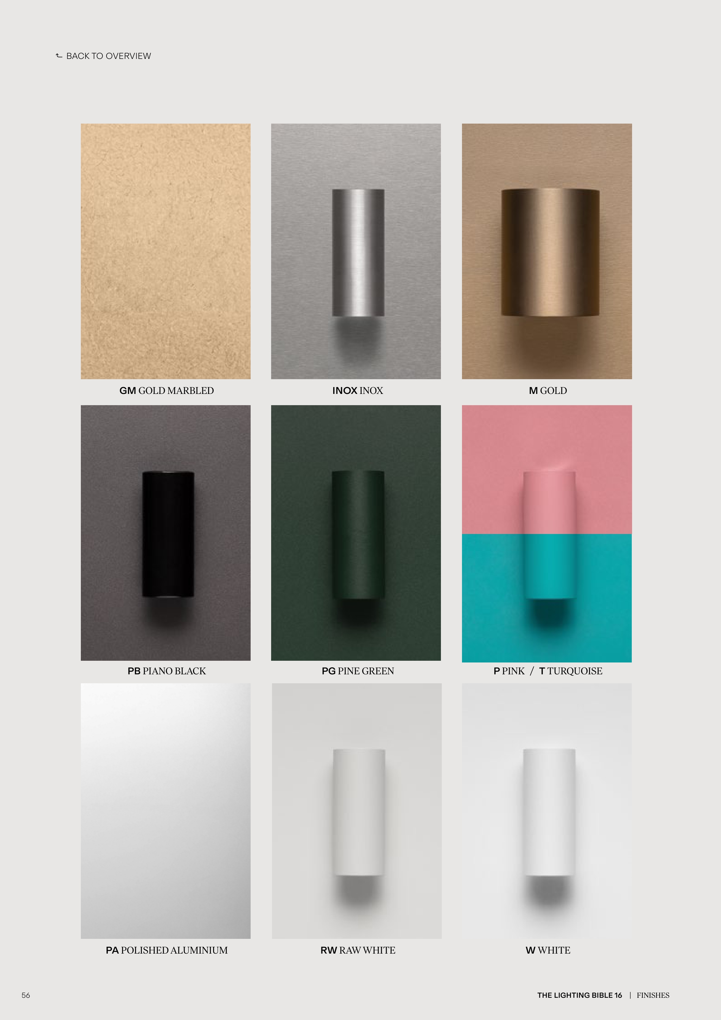 THE LIGHTING BIBLE 16 | FINISHES 56 GM GOLD MARBLED PB PIANO BLACK PA POLISHED ALUMINIUM INOX INOX PG PINE GREEN RW RAW WHITE W WHITE M GOLD P PINK / T TURQUOISE BACK TO OVERVIEW ⤴