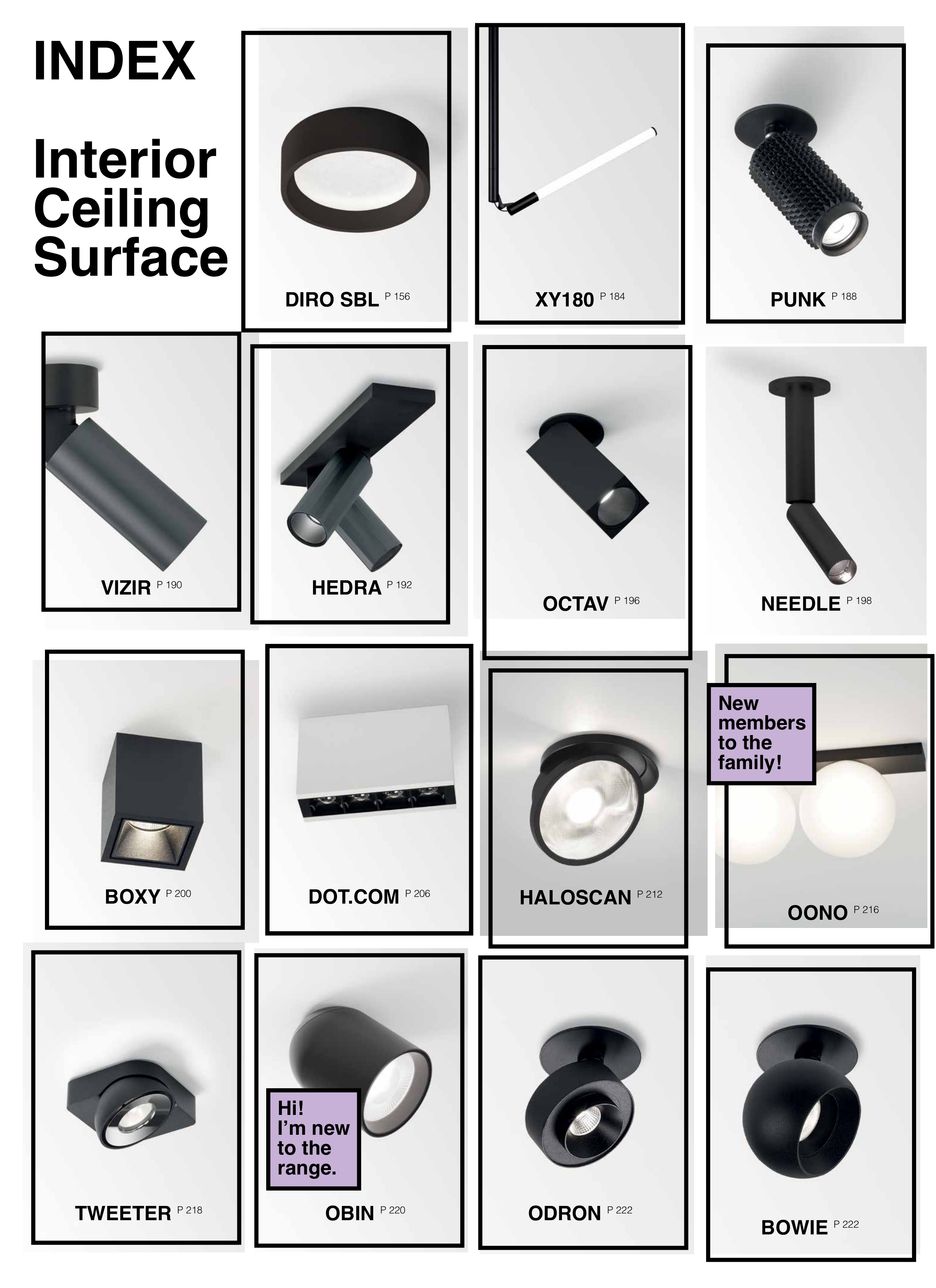 INDEX Interior Ceiling Surface DIRO SBL P 156 Hi! I’m new to the range. OCTAV P 196 OONO P 216 New members to the family! XY180 P 184 PUNK P 188 VIZIR P 190 HEDRA P 192 NEEDLE P 198 BOXY P 200 TWEETER P 218 OBIN P 220 ODRON P 222 BOWIE P 222 DOT.COM P 206 HALOSCAN P 212