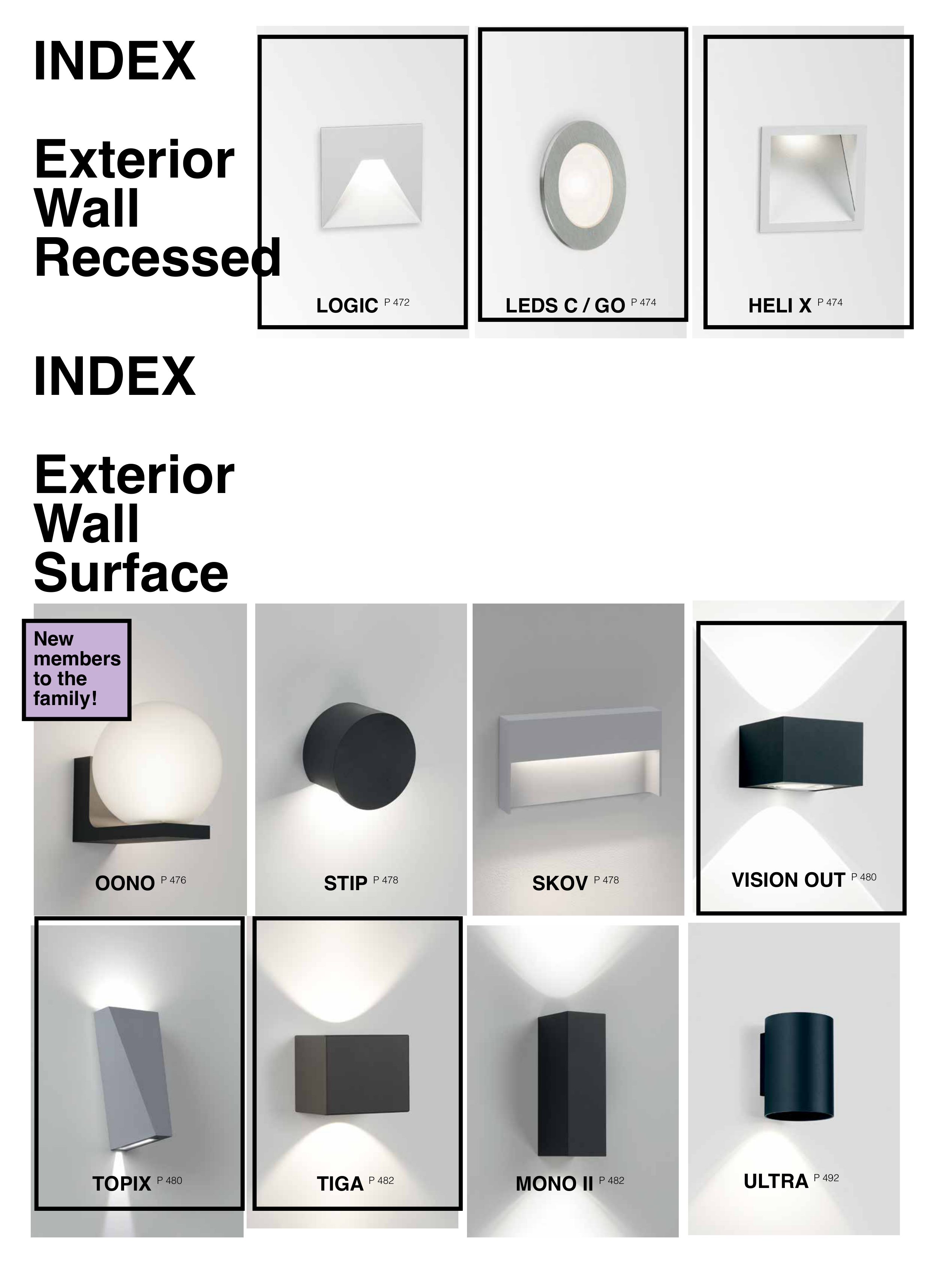 INDEX Exterior Wall Recessed INDEX Exterior Wall Surface VISION OUT P 480 LOGIC P 472 TOPIX P 480 OONO P 476 LEDS C / GO P 474 TIGA P 482 STIP P 478 HELI X P 474 MONO II P 482 ULTRA P 492 SKOV P 478 New members to the family!