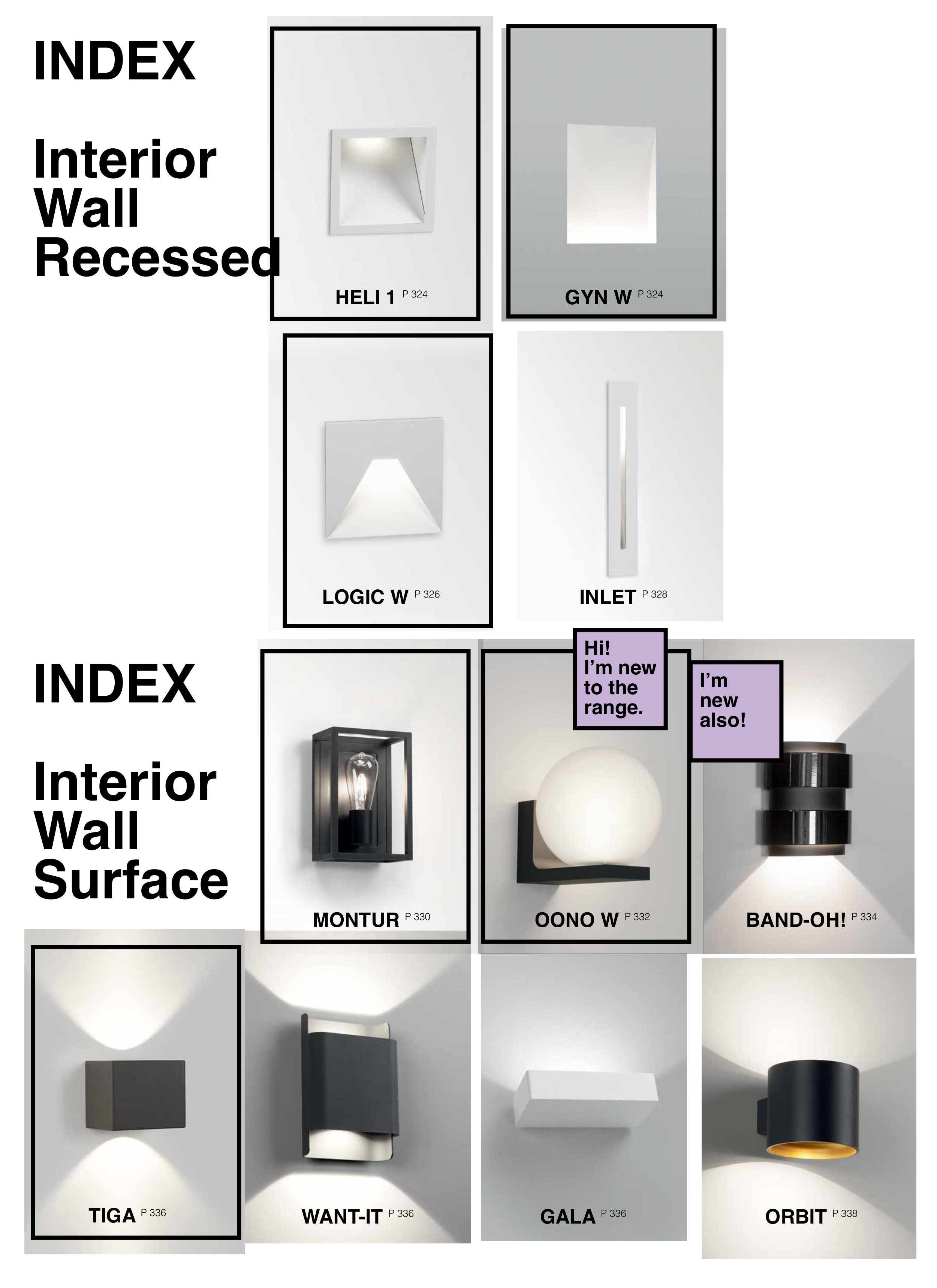 INDEX Interior Wall Recessed INDEX Interior Wall Surface HELI 1 P 324 MONTUR P 330 OONO W P 332 GYN W P 324 BAND-OH! P 334 TIGA P 336 WANT-IT P 336 GALA P 336 ORBIT P 338 LOGIC W P 326 INLET P 328 I’m new also! Hi! I’m new to the range.