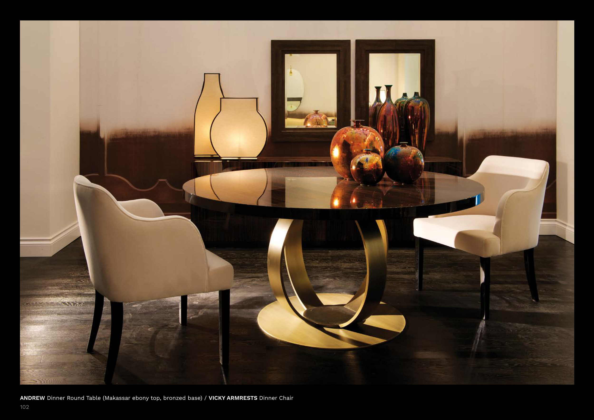 ANDREW Dinner Round Table (Makassar ebony top, bronzed base) / VICKY ARMRESTS Dinner Chair