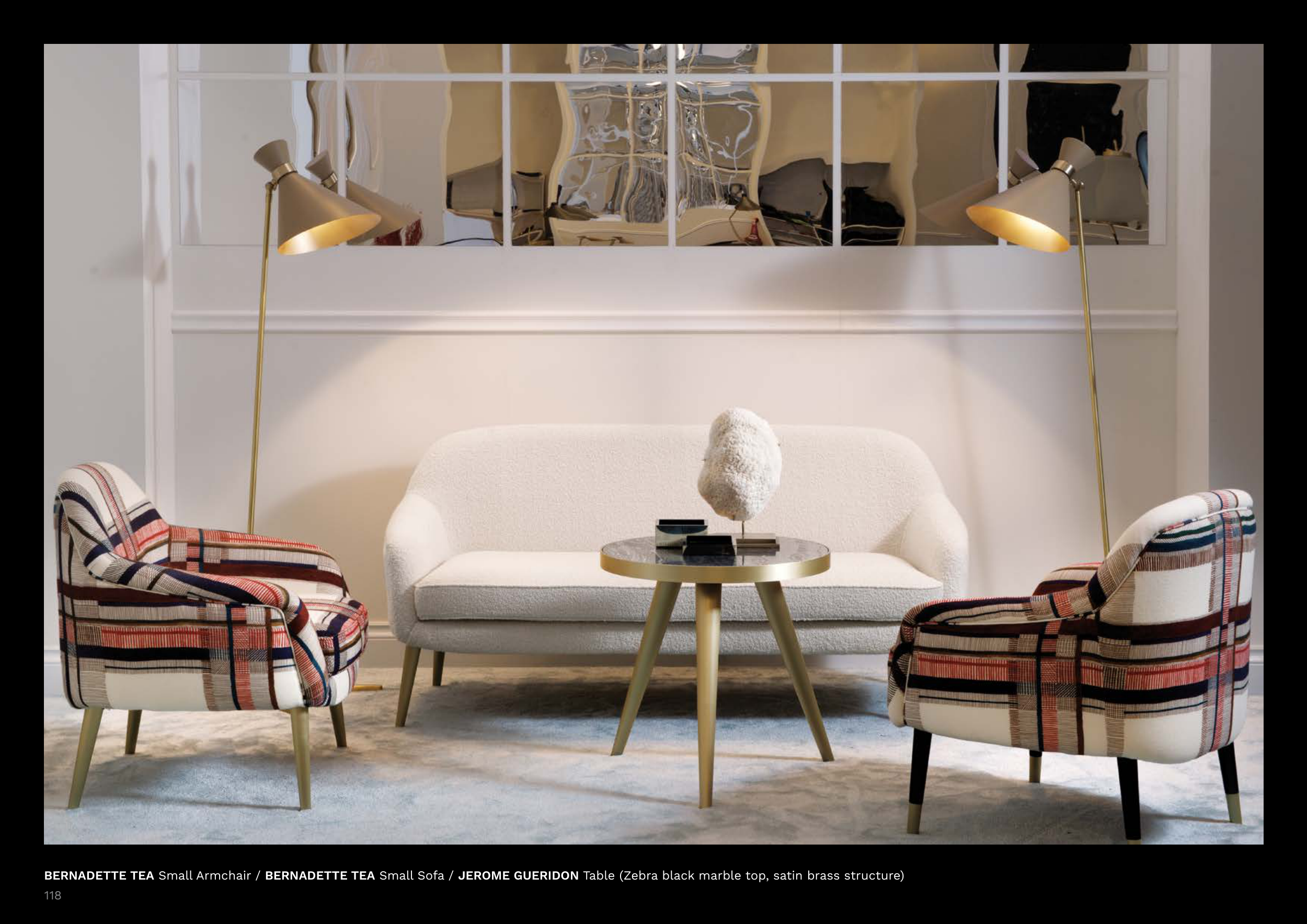 BERNADETTE TEA Small Armchair / BERNADETTE TEA Small Sofa / JEROME GUERIDON Table (Zebra black marble top, satin brass structure)