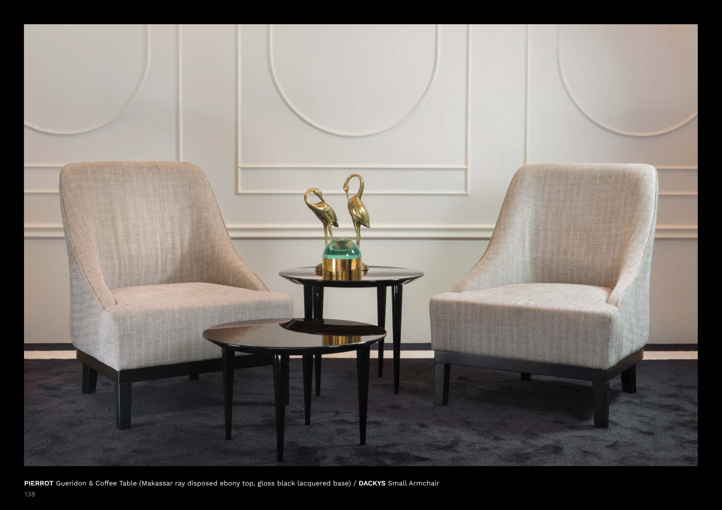 PIERROT Gueridon & Coffee Table (Makassar ray disposed ebony top, gloss black lacquered base) / DACKYS Small Armchair