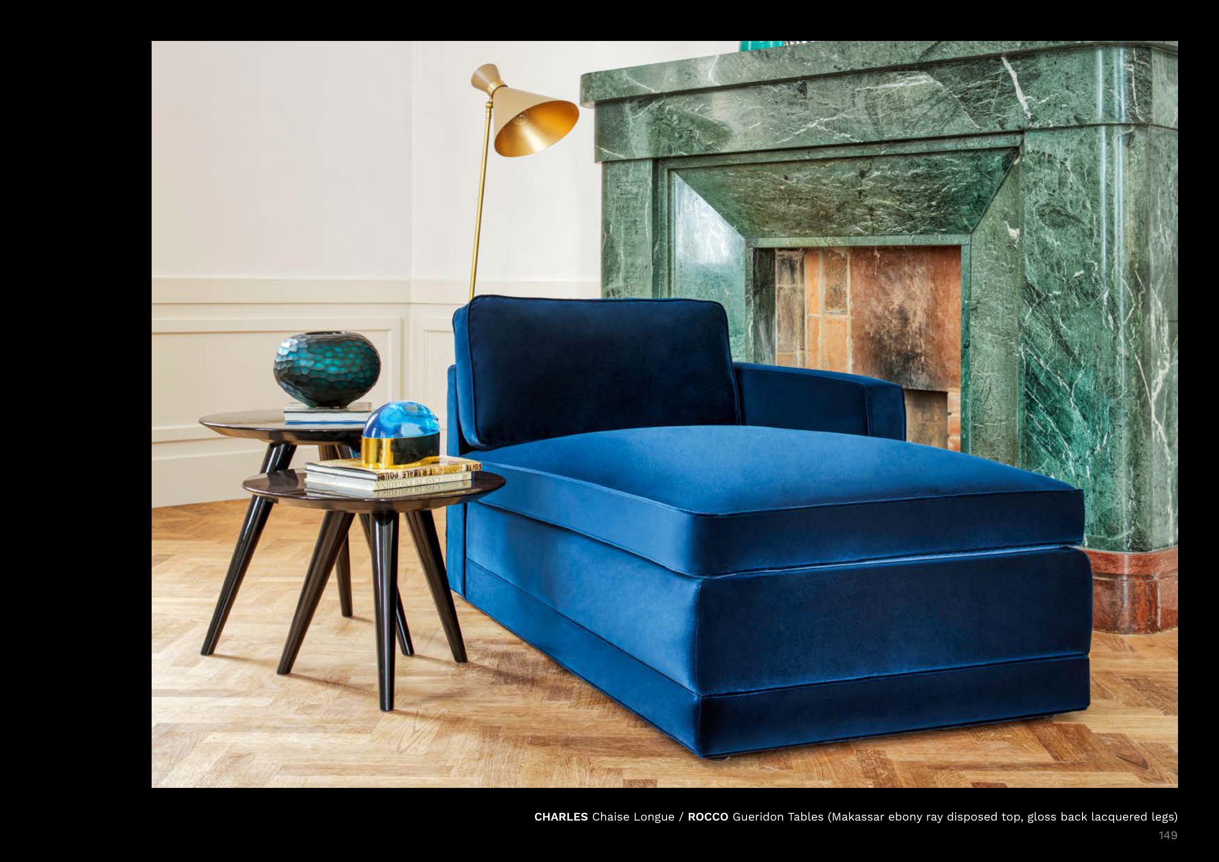 CHARLES Chaise Longue / ROCCO Gueridon Tables (Makassar ebony ray disposed top, gloss back lacquered legs)