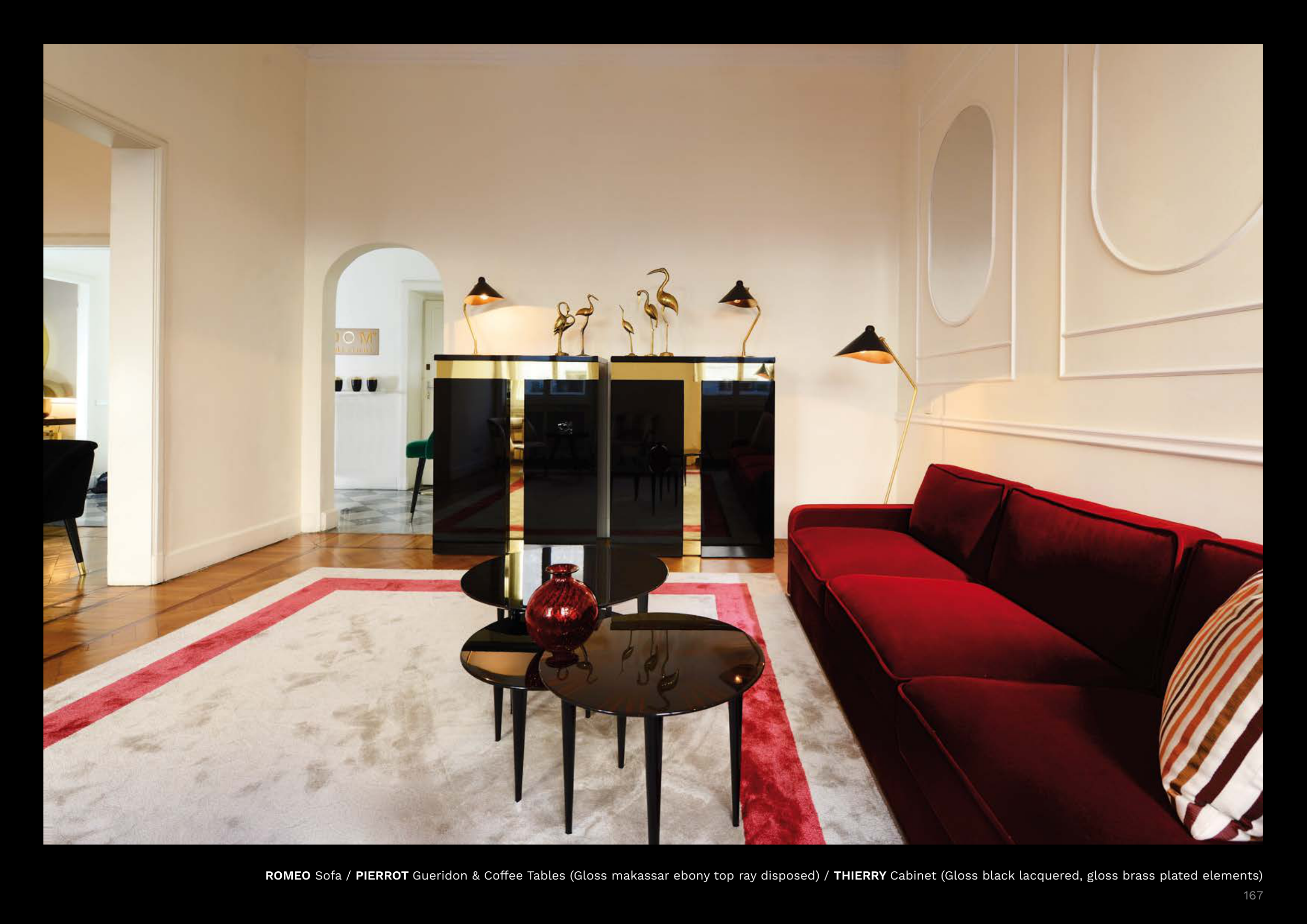 ROMEO Sofa / PIERROT Gueridon & Coffee Tables (Gloss makassar ebony top ray disposed) / THIERRY Cabinet (Gloss black lacquered, gloss brass plated elements)