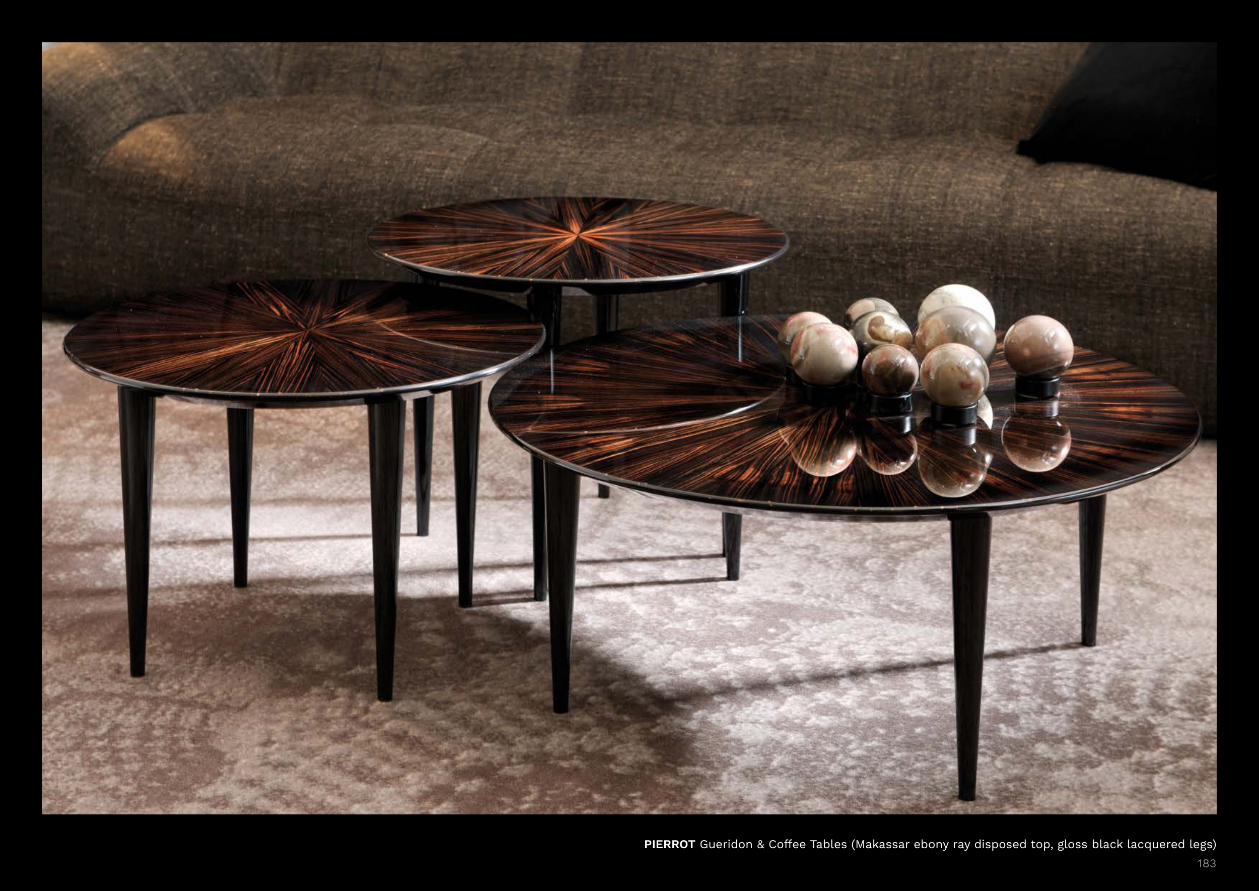 PIERROT Gueridon & Coffee Tables (Makassar ebony ray disposed top, gloss black lacquered legs)