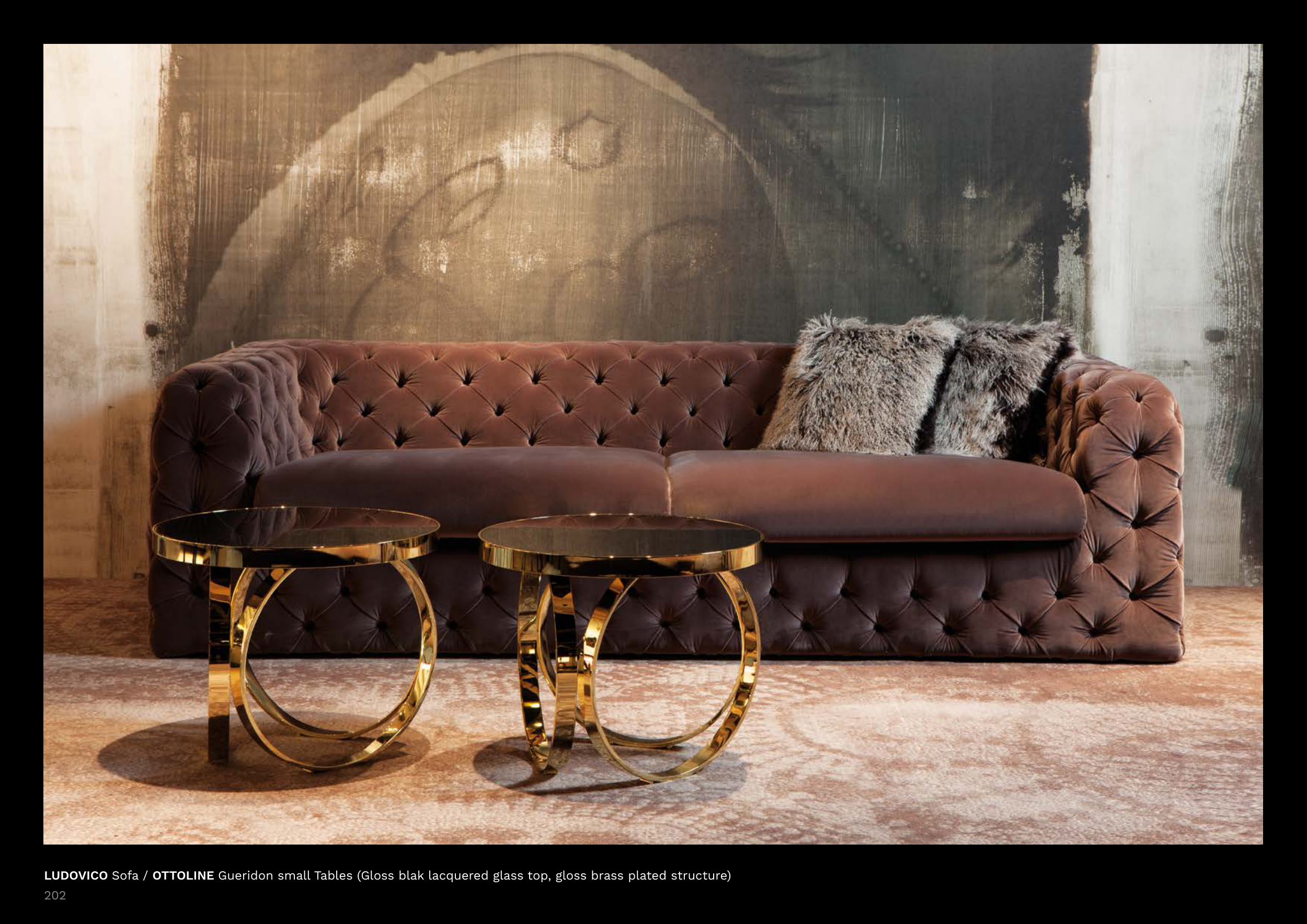 LUDOVICO Sofa / OTTOLINE Gueridon small Tables (Gloss blak lacquered glass top, gloss brass plated structure)