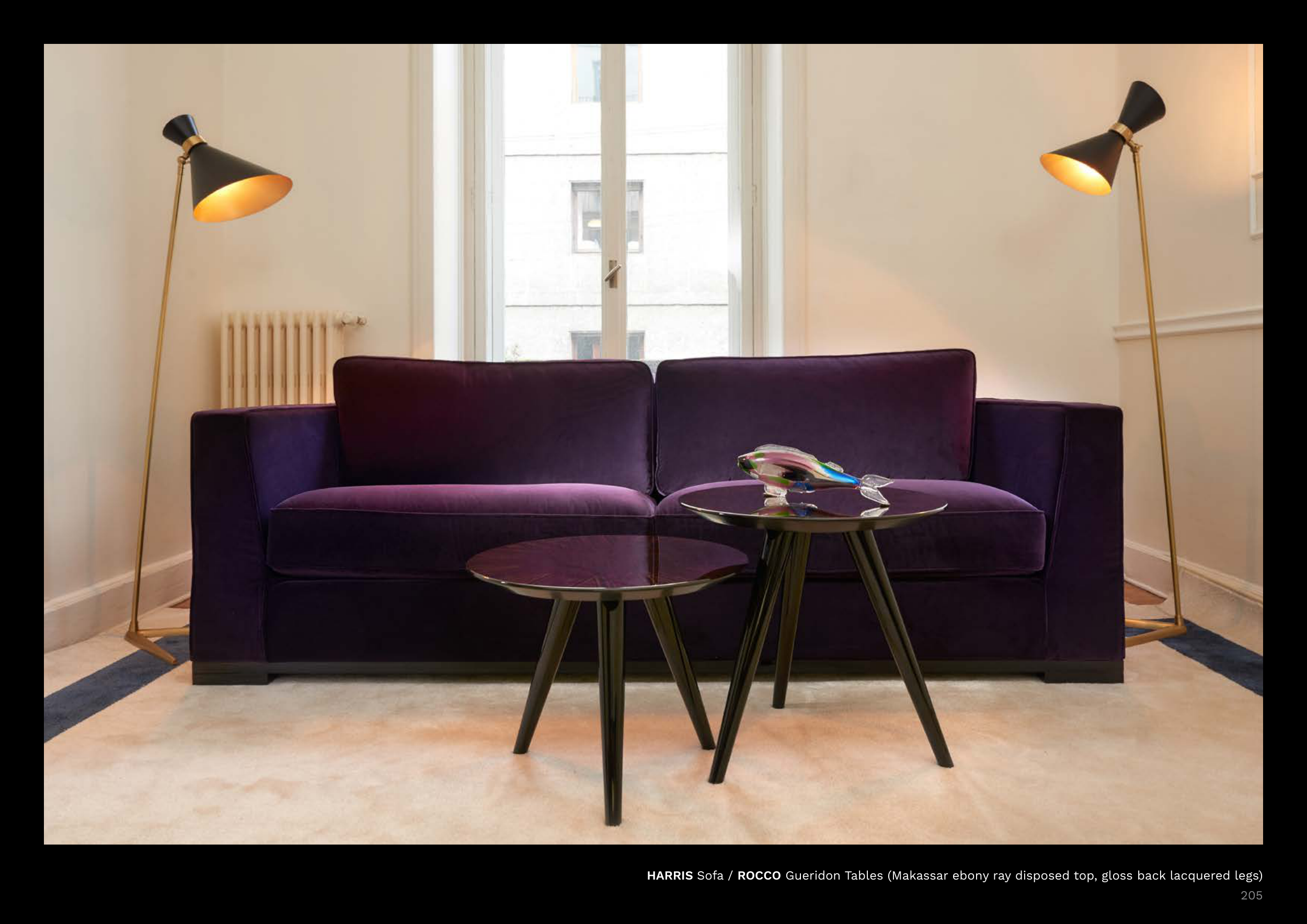 HARRIS Sofa / ROCCO Gueridon Tables (Makassar ebony ray disposed top, gloss back lacquered legs)