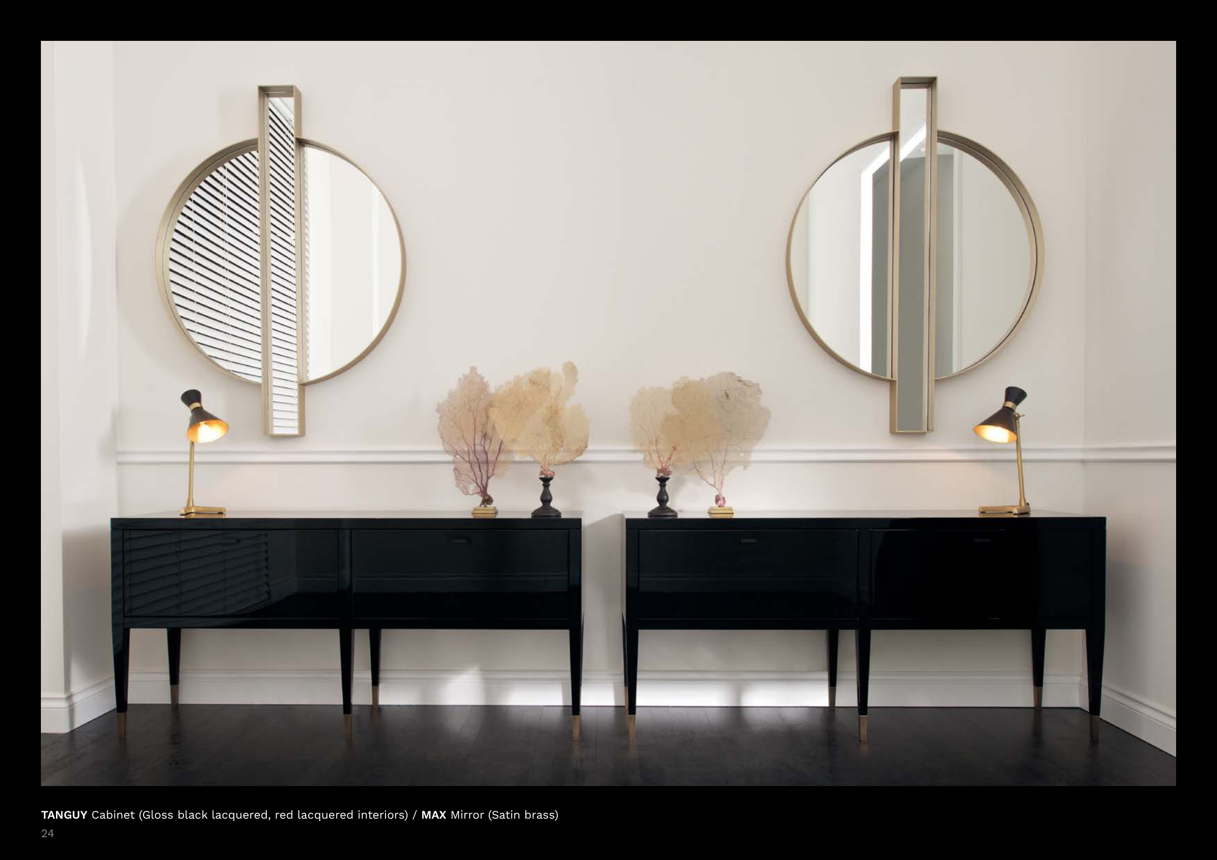 TANGUY Cabinet (Gloss black lacquered, red lacquered interiors) / MAX Mirror (Satin brass)