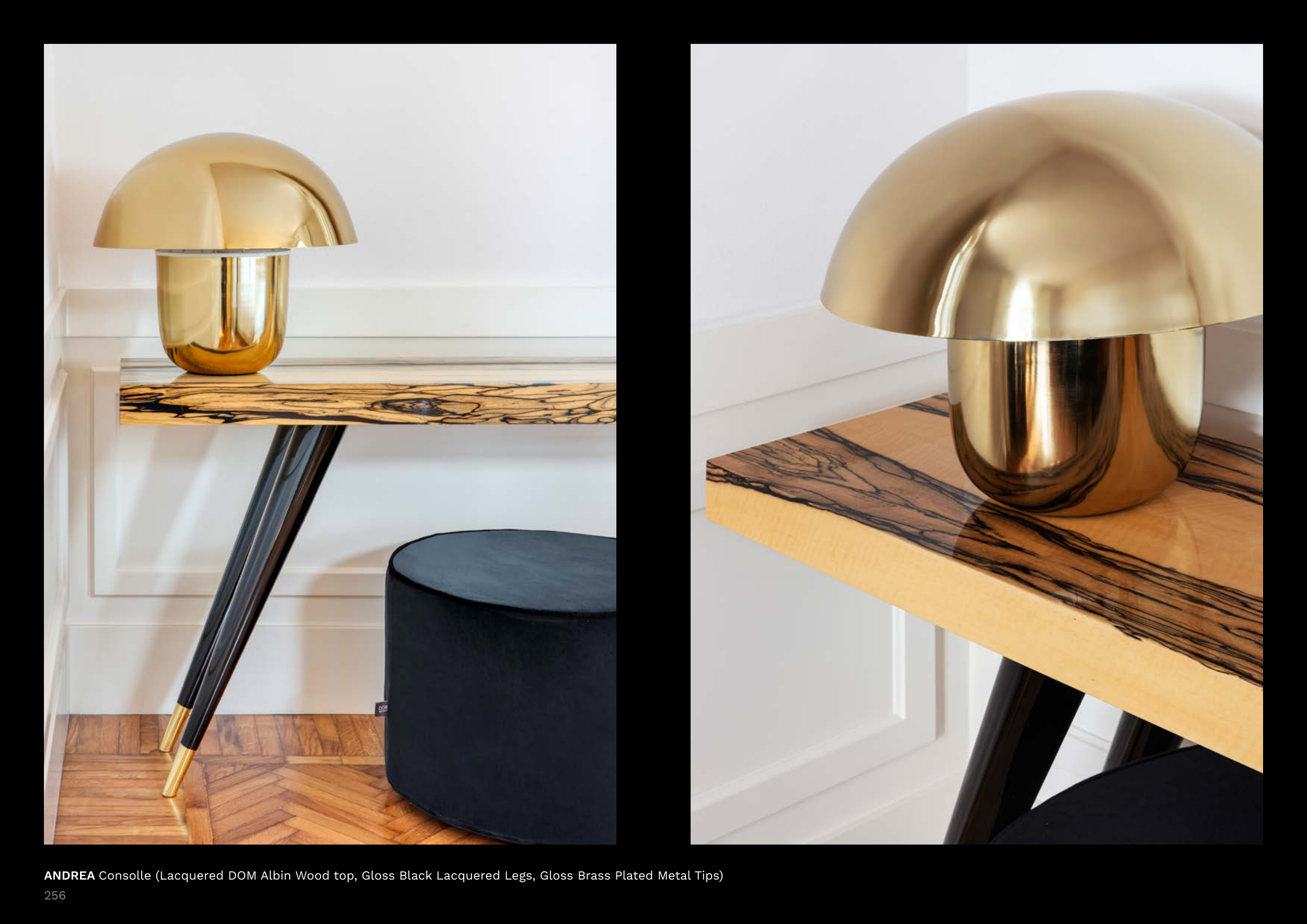 ANDREA Consolle (Lacquered DOM Albin Wood top, Gloss Black Lacquered Legs, Gloss Brass Plated Metal Tips)